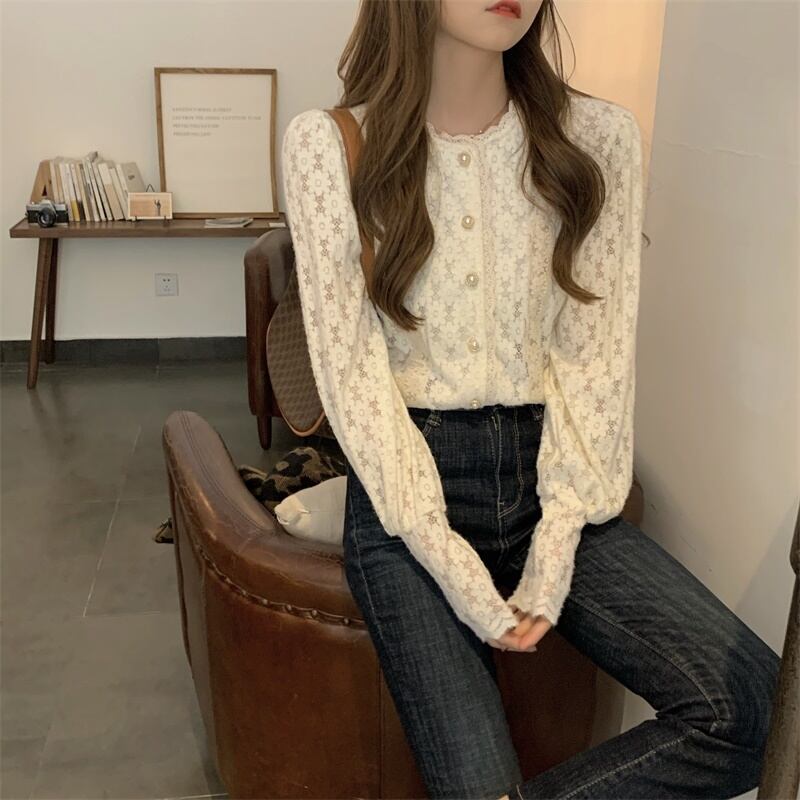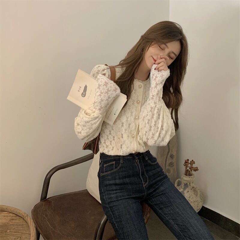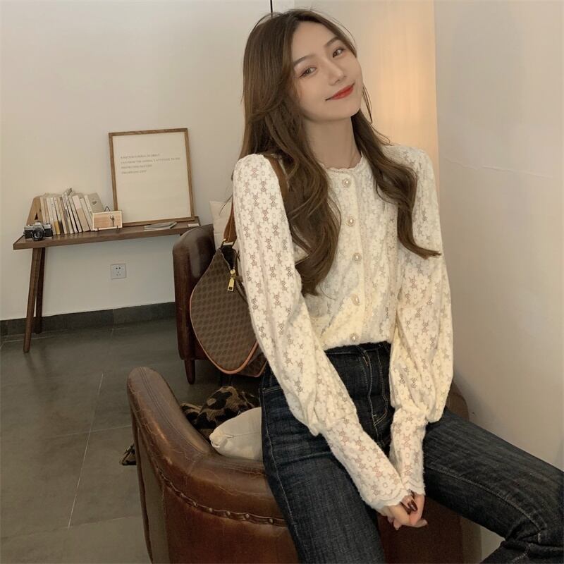 トップス レディース ブラウス 長袖 パフスリーブ ラウンドネック レース 刺繍 パールボタン かわいい 大人可愛い きれいめ カジュアル おしゃれ お洒落 大人女子 ラブリー キュート ガーリー エレガント フェミニン 花柄 10代 20代 30代 OL 通勤 学生 通学 デート お出かけ 女子会 着回し 普段使い 韓国 韓国系 送料無料 ファッション コーデ スタイル モテ トレンド 流行 インスタ映え S M L XL アプリコット