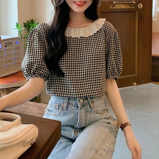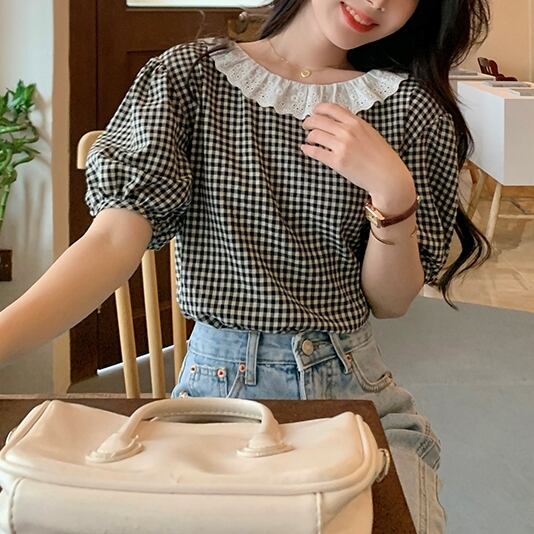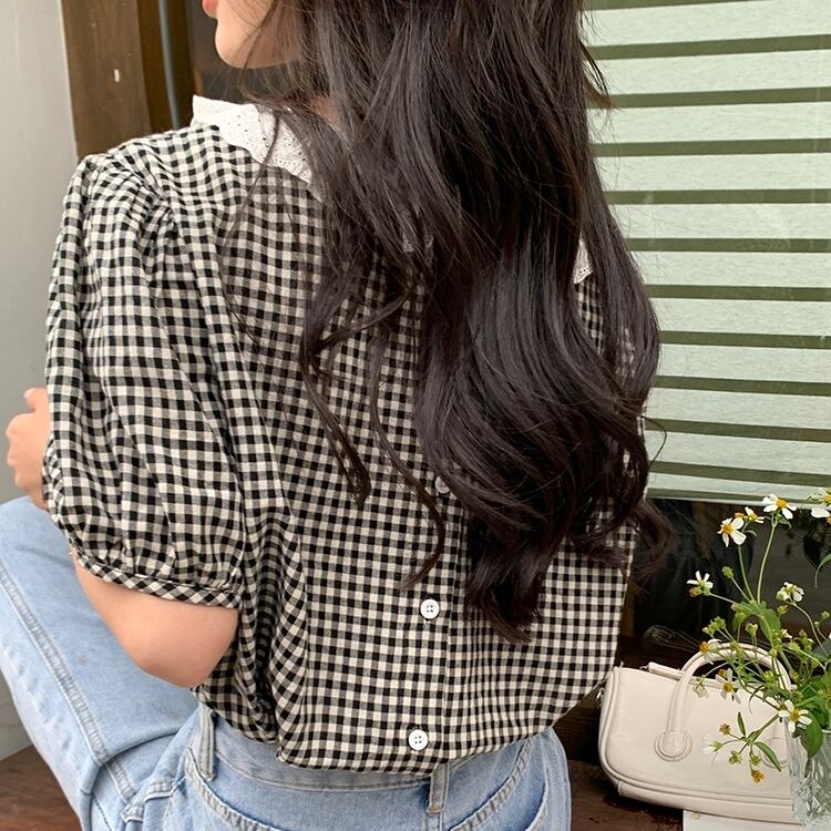 トップス レディース シャツ ブラウス パフスリーブ 半袖 バックボタン レースカラー ラウンドネック かわいい 大人可愛い おしゃれ お洒落 レトロ 大人女子 こなれ感 ラブリー キュート ガーリー 主役級 存在感 チェック柄 ギンガムチェック 夏 10代 20代 学生 通学 デート お出かけ 休日 着回し 普段使い 韓国 韓国系 送料無料 ファッション コーデ スタイル モテ プチプラ トレンド 流行 インスタ映え S M L XL ブラック ホワイト