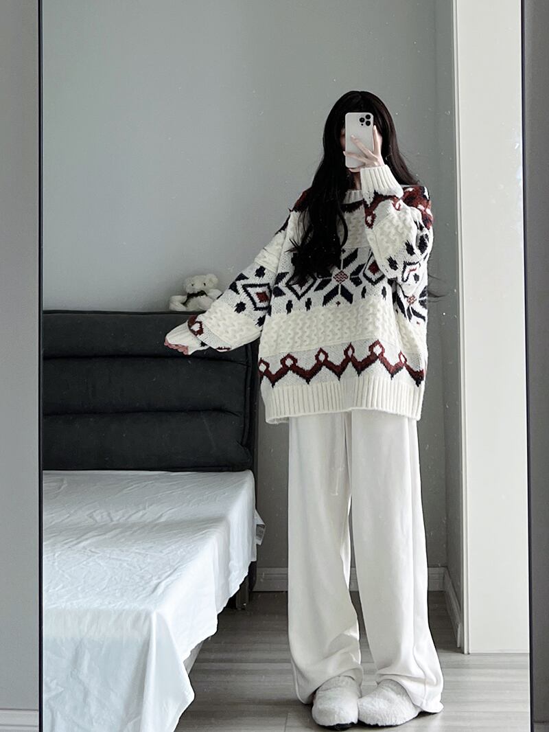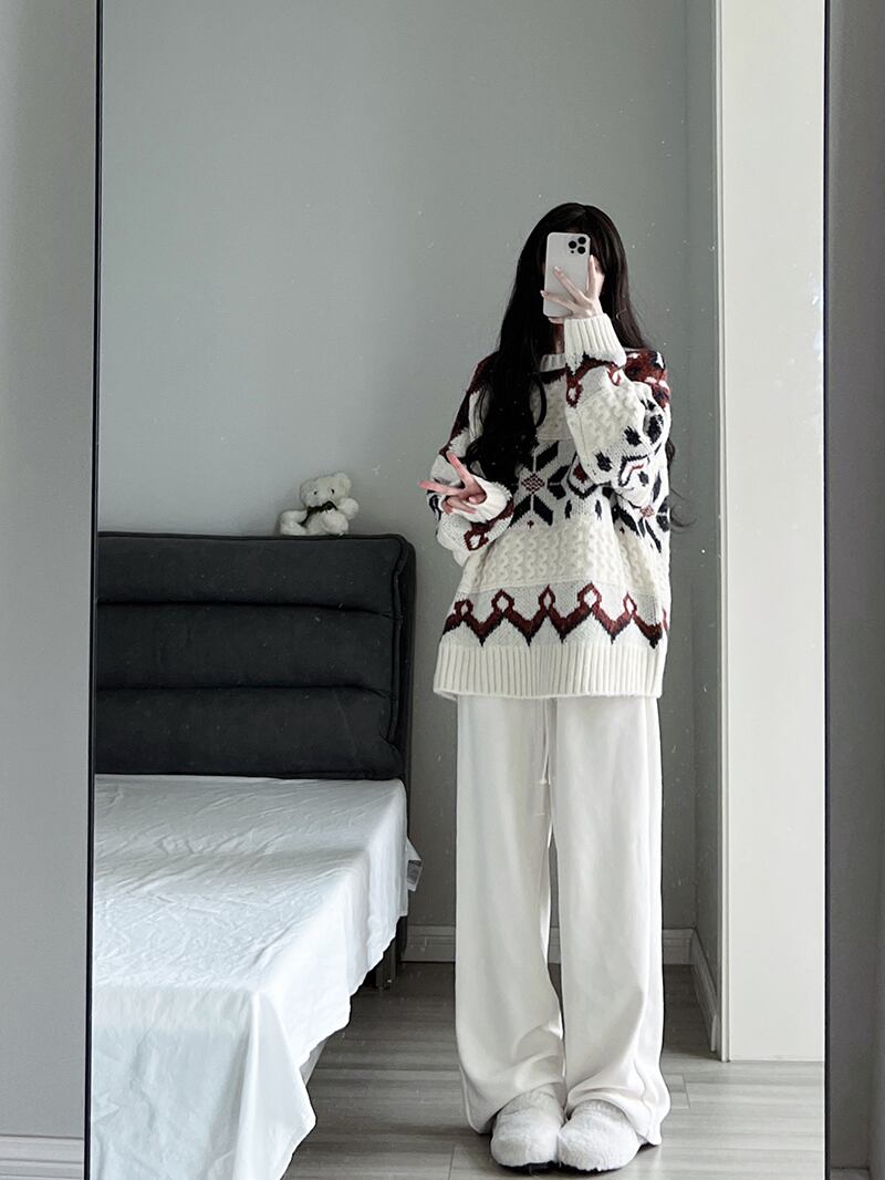 トップス レディース ニット セーター プルオーバー 長袖 ラウンドネック かわいい 大人可愛い カジュアル おしゃれ お洒落 レトロ ラフ ラブリー キュート フェミニン ノルディック 秋 冬 10代 20代 30代 40代 ママ 学生 通学 デート お出かけ 休日 着回し 普段使い 韓国 韓国系 送料無料 ファッション コーデ スタイル モテ 体型カバー トレンド 流行 インスタ映え フリーサイズ ゆったり ゆる 白 ホワイト ルーズシルエット