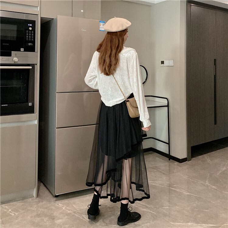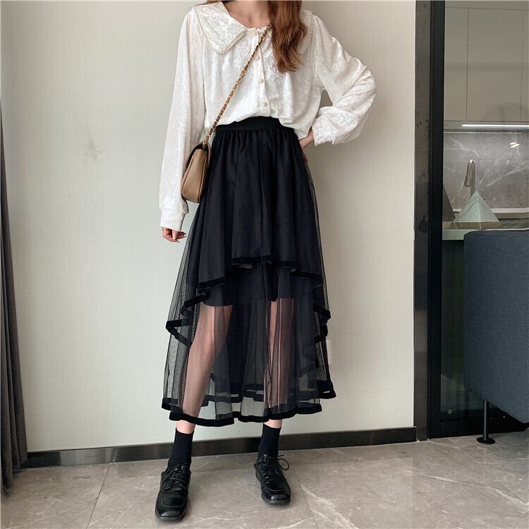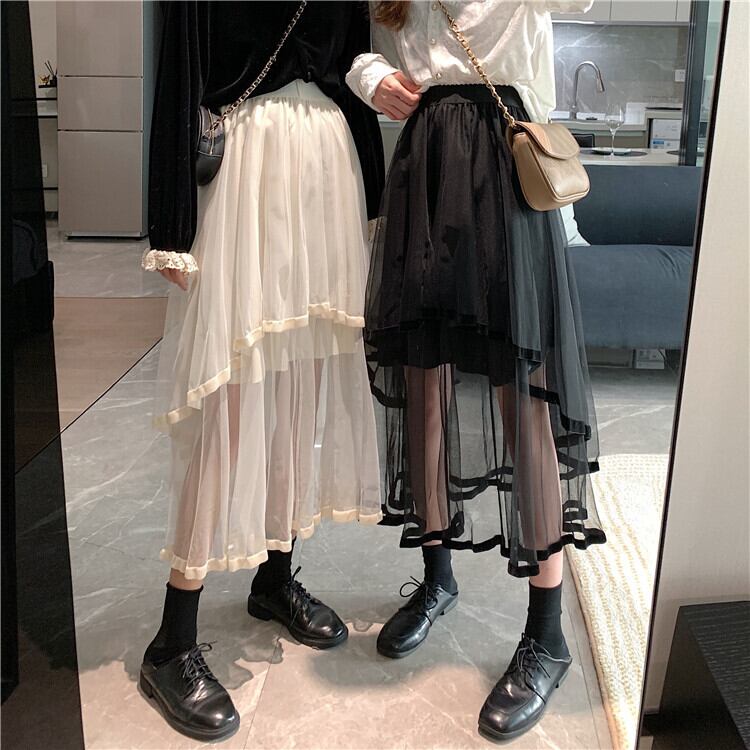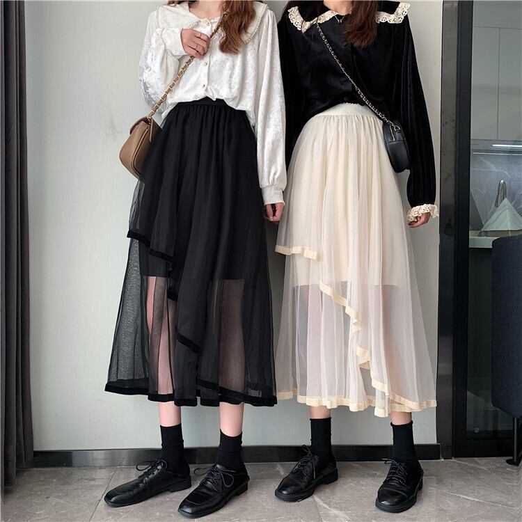 スカート レディース ミモレ丈 チュールスカート ロング アシンメトリー 透け感 シースルー シフォン シアー メッシュ ふんわり かわいい 大人可愛い きれいめ エレガント 無地 フリーサイズ ベージュ ブラック 黒 春 秋 10代 20代 学生 通学 デート お出かけ 休日 パーティー 旅行 コンサート カフェ巡り 送料無料 韓国 韓国系 着回し 普段使い 体型カバー 美脚 脚長 ファッション コーデ モテ トレンド 流行
