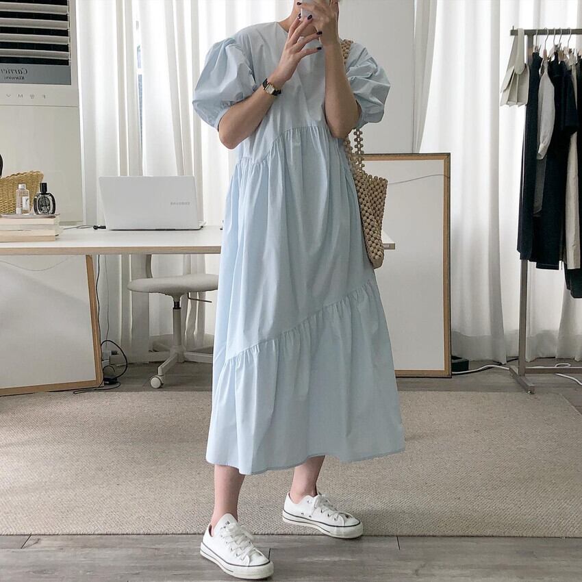 ワンピース レディース フレアワンピース シャツワンピース ロング ロング丈 ギャザー 変形デザイン 半袖 五分袖 5分袖 ランドネック パフスリーブ フレア かわいい 大人可愛い きれいめ 上品 清楚 フェミニン おしゃれ お洒落 送料無料 キュート ガーリー 抜け感 通勤 OL 学生 通学 デート お出かけ 女子会 休日 フリーサイズ ブルー アプリコット 青 白 春 夏 秋 10代 20代 30代 韓国 韓国系 着回し 普段使い プレゼント コーデ スタイル モテ トレンド 流行