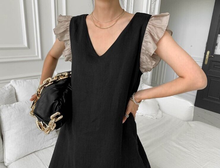 深めのVネックで大人セクシーな一枚に、肩フリルで大人の可愛らしさをプラス♪