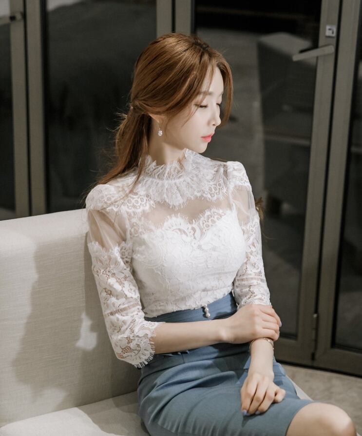 セットアップ レディース トップス ボトムス デニム風 タイトスカート ホワイトレース レース シャツ 2点セット 上下セット S M L 袖あり スカート タイト スリム ハイウエスト ハイネック スタイルアップ スリット 脚長効果 シンプル フェミニン エレガント セクシー 大人女子 おしゃれ お洒落 セレブ イベント デート お出かけ 女子会 休日 旅行 お呼ばれ 着まわし ファッション コーデ モテ 送料無料 こなれ感 ホワイト 白 フリル 繊細 透け感 クラシカル 上品 美シルエット 綺麗 美脚