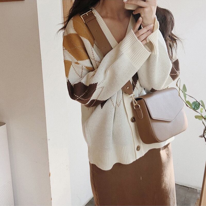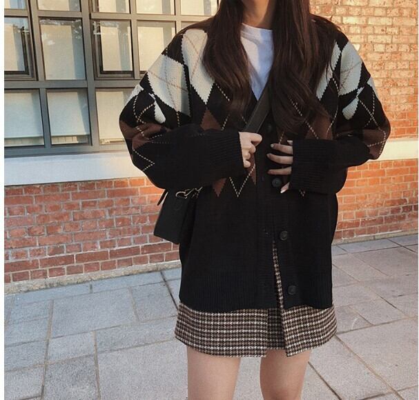 トップス レディース カーディガン Vネック ニット 長袖 かわいい 大人可愛い きれいめ カジュアル フェミニン おしゃれ 送料無料 ラブリー キュート ガーリー ルーズ レトロ ボーイズライク 学生 通学 デート お出かけ お泊まり 休日 フリーサイズ アーガイル柄 アプリコット ブラック 黒 ブラウン 茶色 秋 冬 10代 20代 韓国 韓国系 着回し 普段使い 体型カバー 防寒 ファッション コーデ モテ トレンド 流行 ゆったり ゆる