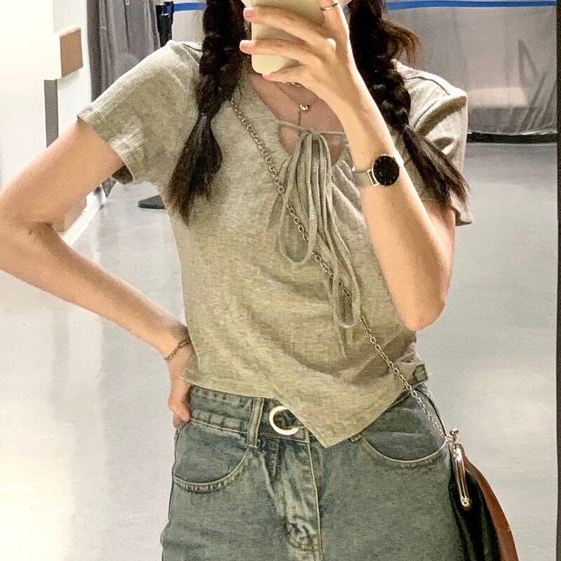 トップス レディース カットソー 半袖 Uネック リボン 薄手 紐 タイト アシンメトリー かわいい 大人可愛い シンプル カジュアル おしゃれ お洒落 ラフ 抜け感 無地 フリーサイズ ワンサイズ グレー 灰色 春 夏 学生 デート お出かけ 女子会 休日 BBQ 送料無料 公園 10代 20代 韓国 普段使い 定番 トレンド プレゼント 着回し ファッション コーデ クロップド丈 Tシャツ