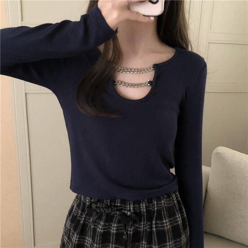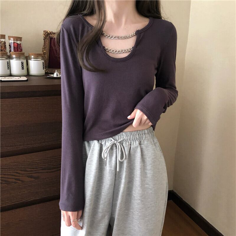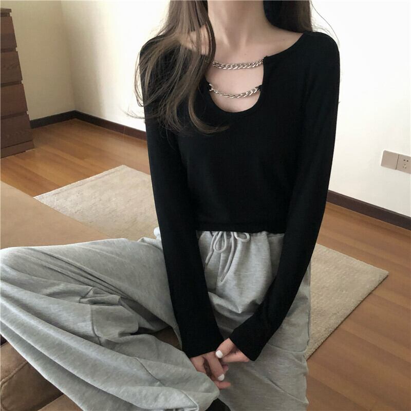 トップス レディース カットソー 6カラー 長袖 シャツ ショートトップ ブラック ホワイト グレー ブラウン ネイビー ダークグレー フリーサイズ ゆったり チェーン ラフ こなれ感 セクシー カジュアル ストリート シンプル 大人女子 きれいめ おしゃれ 20代 30代 40代 通勤 通学 お出かけ 春 秋 着やせ 韓国風 ファッション コーデ インスタ映え 女っぽ 大人っぽ 楽ちん オフィス OL 学生 ママ フェミニン デート 女子会 休日 イベント 旅行 送料無料 抜け感 カラバリ モテ 個性的