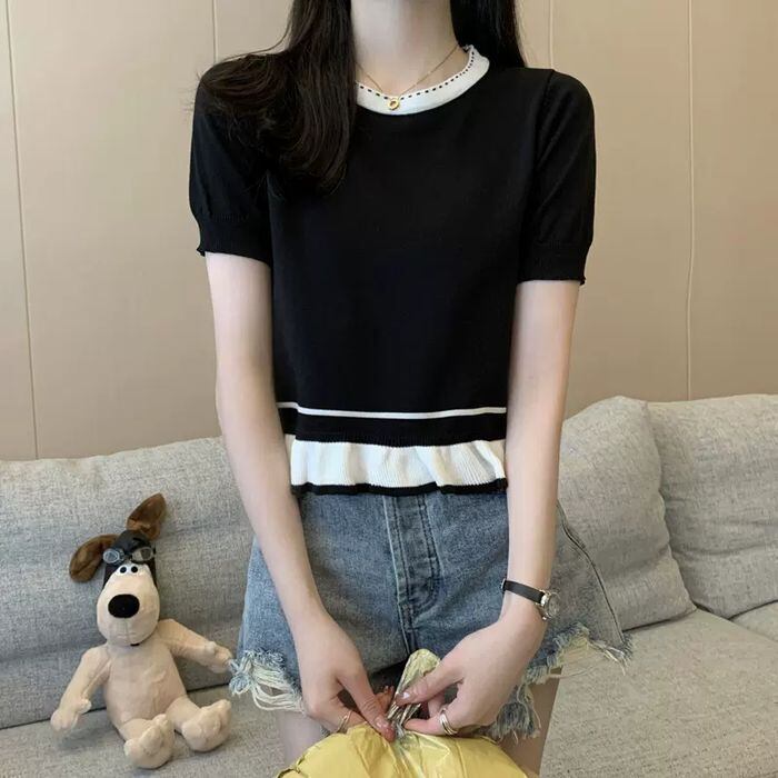 トップス レディース Tシャツ カットソー 半袖 ショート丈 フリル ボーダー ラウンドネック かわいい 大人可愛い カジュアル シンプル おしゃれ お洒落 かっこいい レトロ こなれ感 ラフ キュート 送料無料 存在感 ストライプ 秋 冬 10代 20代 30代 40代 学生 通学 デート お出かけ 女子会 休日 着回し 普段使い 重ね着 韓国 韓国系 ファッション コーデ スタイル モテ トレンド 流行 インスタ映え ゆったり ゆる ブラック ホワイト ブルー イエロー