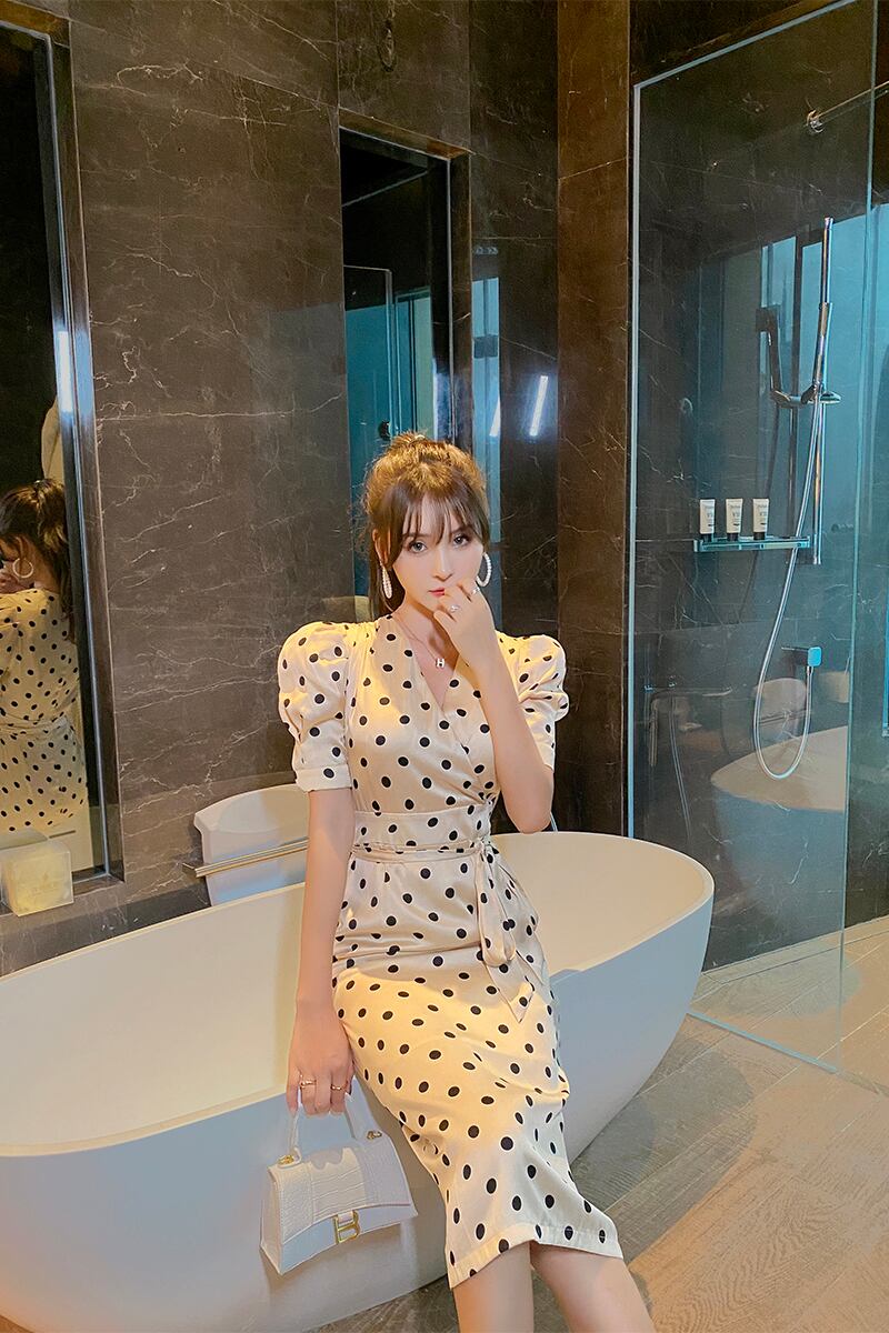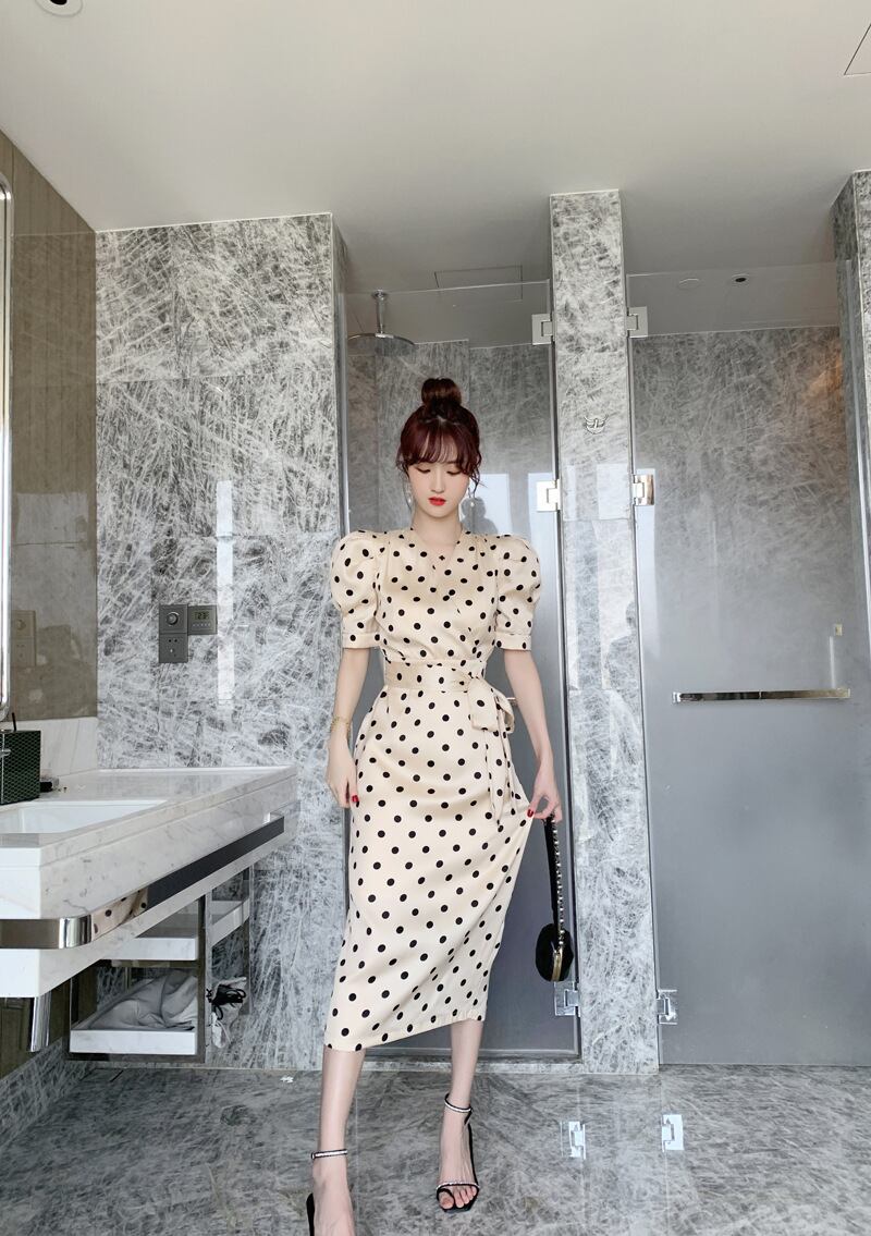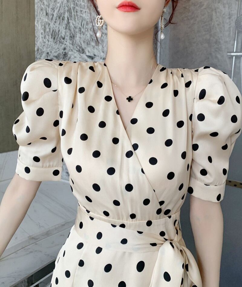 ワンピース レディース ドレス 膝丈 ひざ丈 袖あり 半袖 パフスリーブ カシュクール タイト ウエストマーク ウエストリボン 透け感 かわいい 大人可愛い きれいめ シンプル 上品 エレガント 清楚 フェミニン シック おしゃれ お洒落 綺麗 お嬢様 フォーマル おとな 送料無料 個性的 レトロ モダン ロマンチック 華やか ドット 水玉 デート 女子会 パーティー イベント S M L アプリコット 春 夏 10代 20代 30代 40代 ママ 女性用 韓国 コーデ スタイル プチプラ モテ