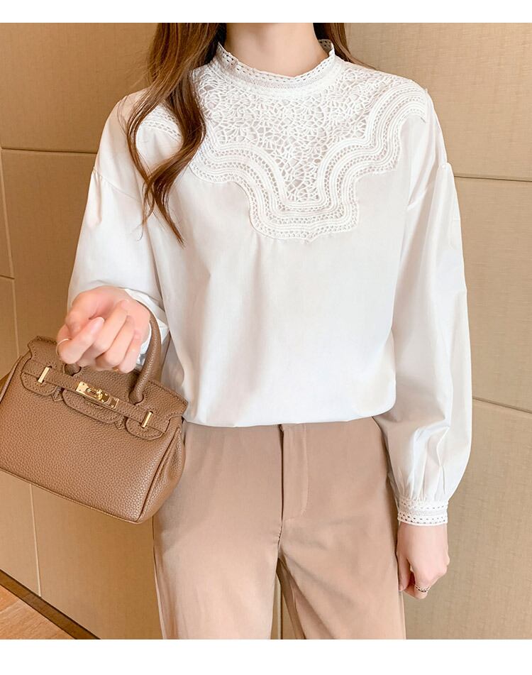 トップス レディース シャツ S M L XL ホワイト ブラウス 無地 長袖 パフスリーブ スタンドカラー ドロップショルダー レース ハリ感 ゆったり 綿 シンプル きれいめ カジュアル フェミニン キュート 上品 大人可愛い おしゃれ 普段使い デート お出かけ 女子会 休日 旅行 通勤 通学 お呼ばれ 着まわし ファッション コーデ スタイル モテ 送料無料 こなれ感 韓国系 ユニーク 春 秋 冬