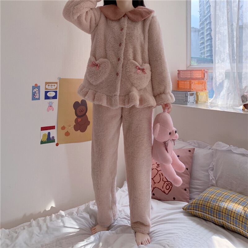 ルームウェア レディース セットアップ 上下セット パジャマ 部屋着 寝間着 お家コーデ 長袖 襟付き リボン ポケット もこもこ ふわふわ かわいい 大人可愛い フェミニン お洒落 ナチュラル 送料無料 ラブリー キュート ガーリー ルーズ リラックス ハート 女子会 お泊まり 旅行 フリーサイズ ゆったり ゆる 冬 2点セット 10代 20代 女の子 韓国 韓国系 楽ちん ギフト プレゼント コーデ お揃い モテ トレンド 流行 インスタ映え パジャマパーティ ピンク