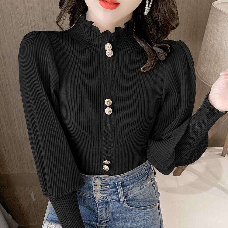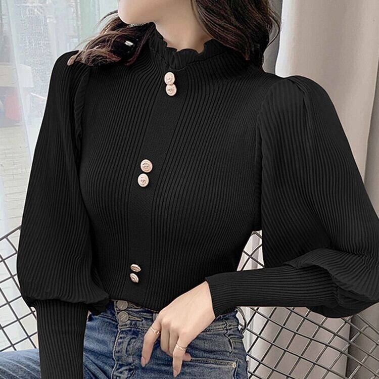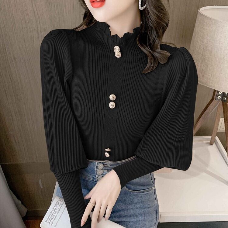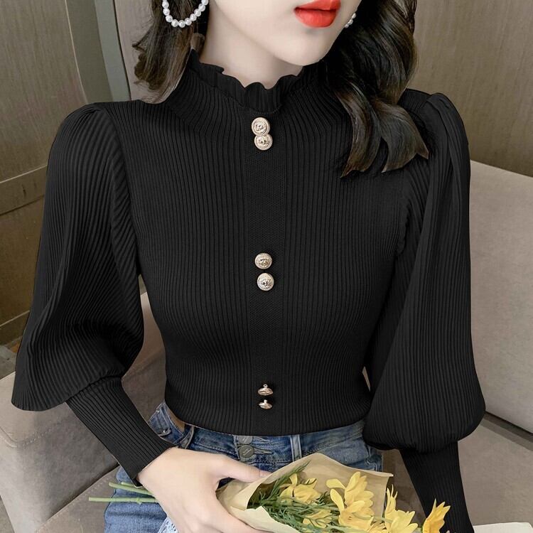 トップス レディース 4色 ニット 長袖 ランタンスリーブ ハイネック スリム 細身 レース フリル プルオーバー ボタン かわいい 大人可愛い きれいめ シンプル カジュアル 上品 エレガント 清楚 おしゃれ 綺麗 お嬢様 ナチュラル レトロ アンティーク 華やか 無地 OL 通勤 学生 通学 デート お出かけ 女子会 散歩 カフェ 送料無料 フリーサイズ ゆる ホワイト アプリコット ブラック ブラウン 春 秋 冬 10代 20代 30代 40代 韓国系 着回し 普段使い ファッション コーデ モテ