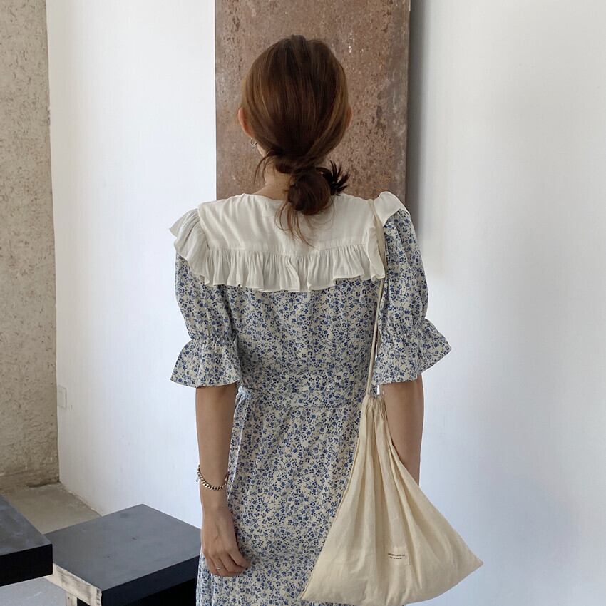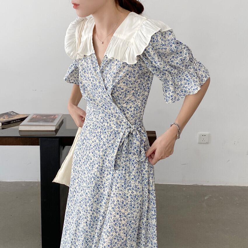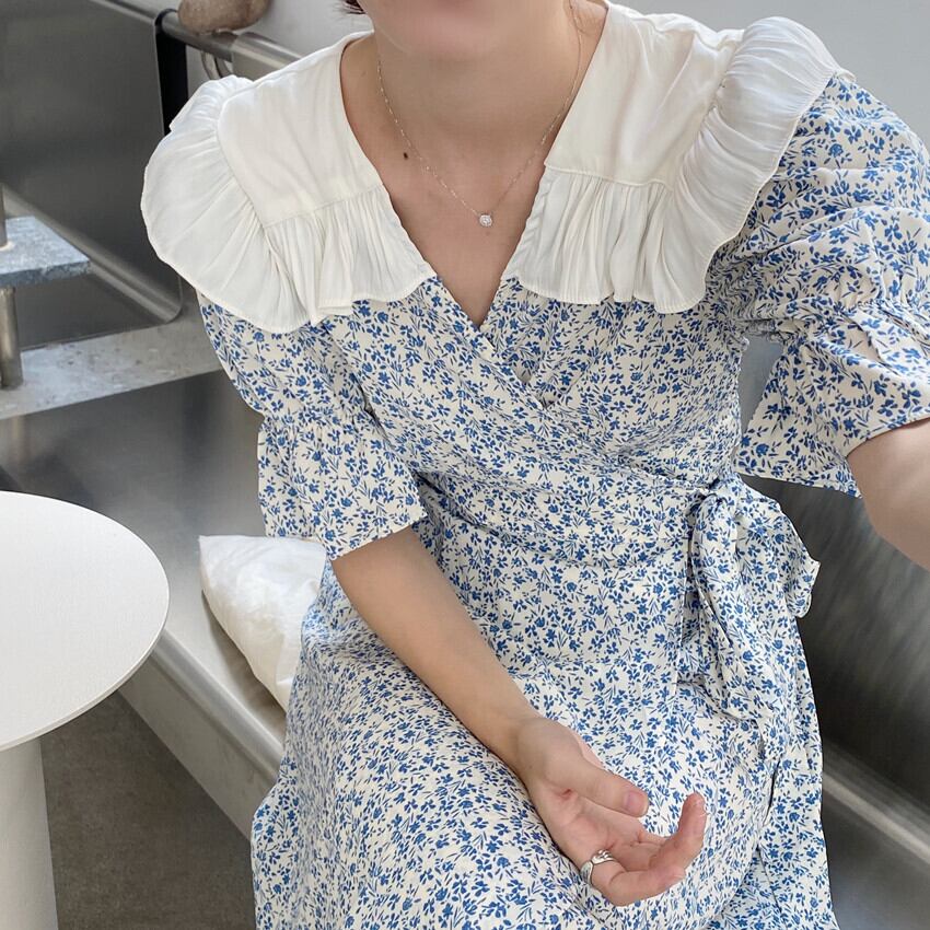 【着用レビュー】ワンピース レディース フレアワンピース カシュクールワンピース ロング丈 アンブレラスリーブ 半袖 Vネック セーラーカラー フリル リボン かわいい 大人可愛い 上品 清楚 おしゃれ お洒落 ラブリー キュート ガーリー レトロ 小花柄 花柄 フラワー 学生 デート お出かけ 女子会 休日 イベント 送料無料 公園 ワンサイズ フリーサイズ ブルー 青 水色 春 夏 10代 20代 30代 韓国 韓国系 普段使い 定番 トレンド ファッション コーデ