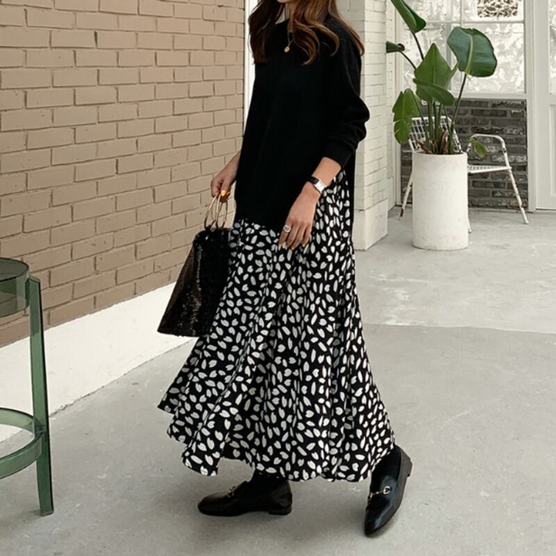 ワンピース レディース ドッキングワンピース 重ね着風 レイヤード風 セーター ロング ロング丈 袖あり 長袖 ラウンドネック フレア 切り替えデザイン 異素材MIX ニット シフォン かわいい 大人可愛い カジュアル おしゃれ 送料無料 無地 花柄 プリント 春 秋 冬 10代 20代 30代 40代 50代 マタニティ ママ 通勤 学生 通学 デート お出かけ 女子会 旅行 着回し 普段使い 楽ちん XL 2XL 3XL 4XL 5XL 大きいサイズ 大きめ ビッグサイズ ゆったり 黒 ブラック 紺