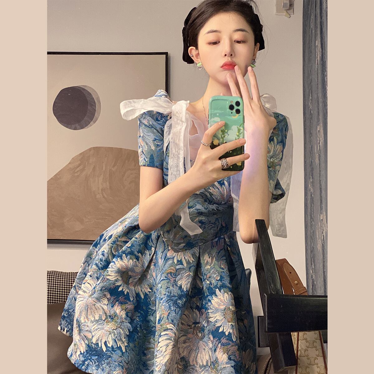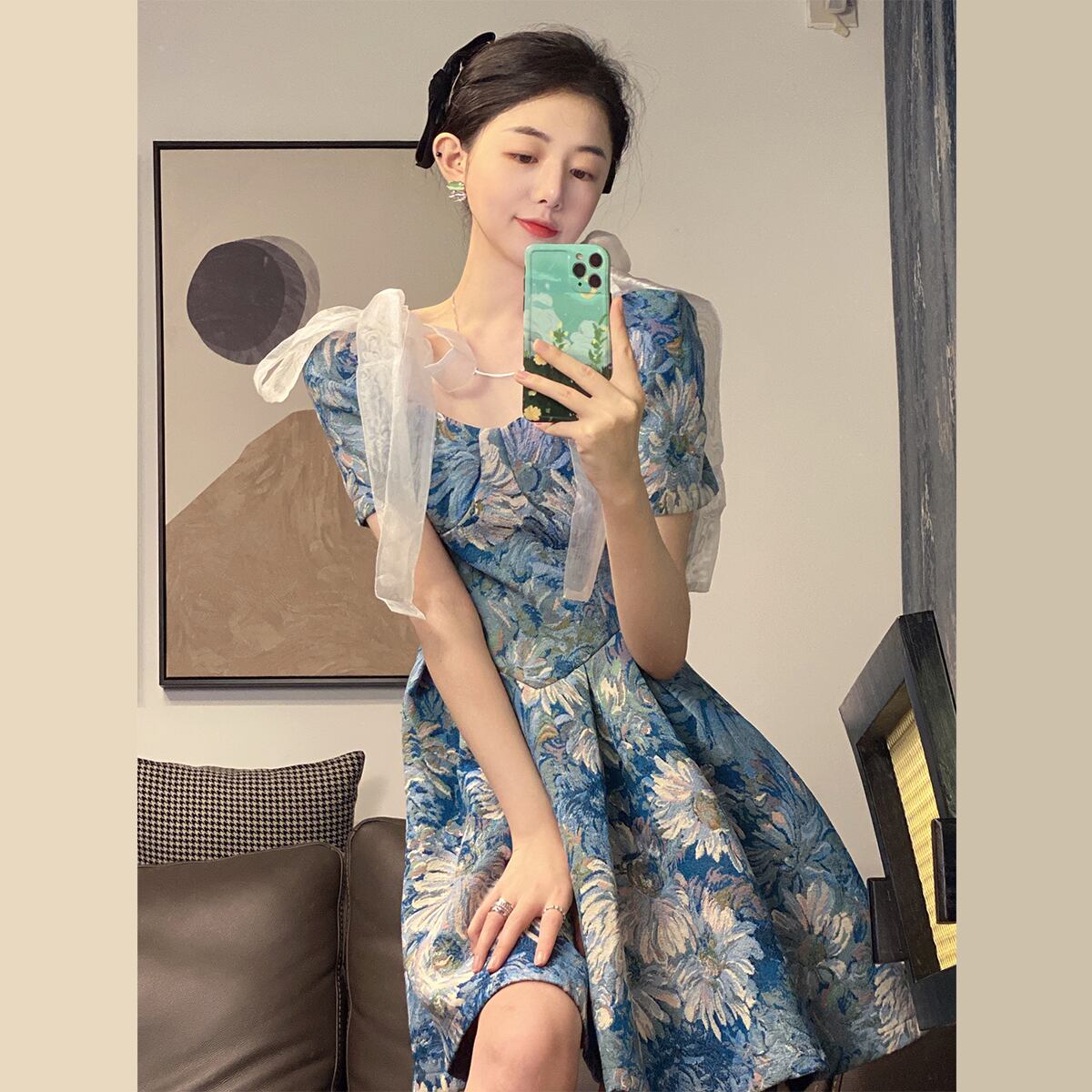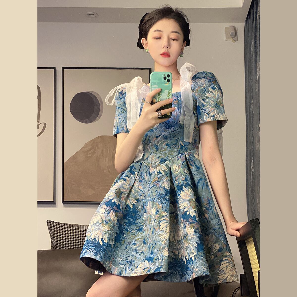 ワンピース レディース 膝上ワンピース 膝上 ふんわりデザイン 絵画風 可愛い かわいい ミニワンピース ミニ丈 大人 上品 お洒落 おしゃれ オシャレ お洒落上級者 レトロ 大人可愛い 大人女子 ラブリー キュート ガーリー 個性的 送料無料 存在感 S M L ブルー 柄 美術 アート 誕生日 バースデー ディナー ランチ 記念日 クリスマス バレンタイン デート お出かけ ショッピング 女子会 休日 アフタヌーンティー パーティー イベント ティー お茶会 インスタ ファッション コーデ スタイル