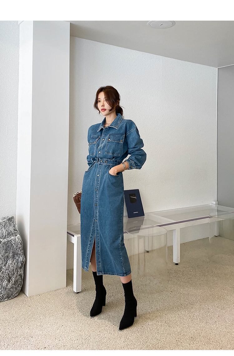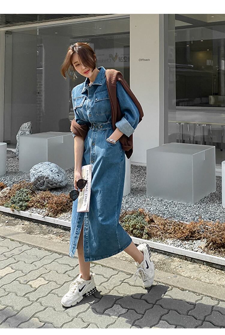 ワンピース レディース デニムワンピース シャツワンピース 長袖 膝丈 襟付き カラー デニム かわいい 大人可愛い きれいめ シンプル カジュアル おしゃれ お洒落 こなれ感 ラフ キュート フェミニン 送料無料 無地 春 夏 秋 冬 10代 20代 30代 40代 学生 通学 デート お出かけ 女子会 休日 着回し 普段使い 重ね着 韓国 韓国系 ファッション コーデ 体型カバー インスタ映え S M L XL 青 ブルー インディゴ デニム生地 お散歩 空旅 トラベル 合コン ランチ