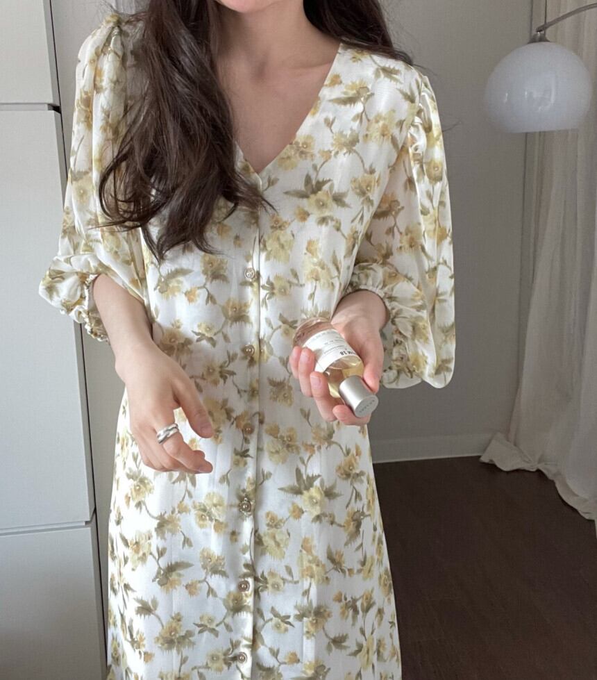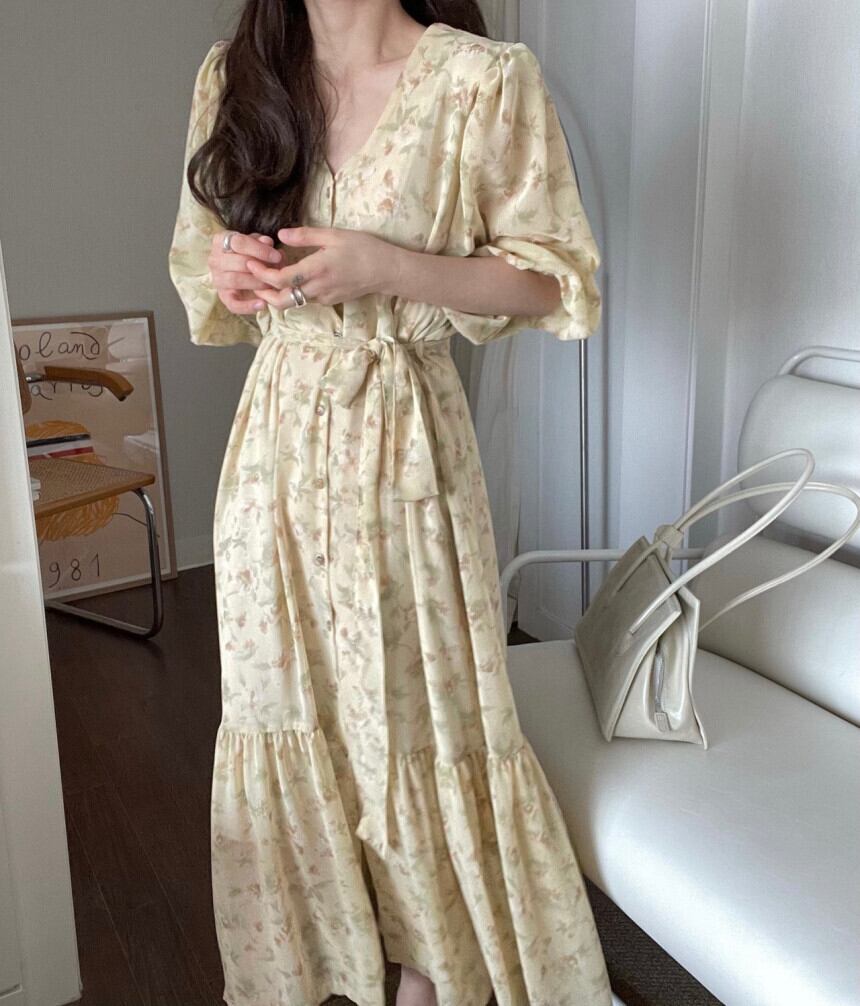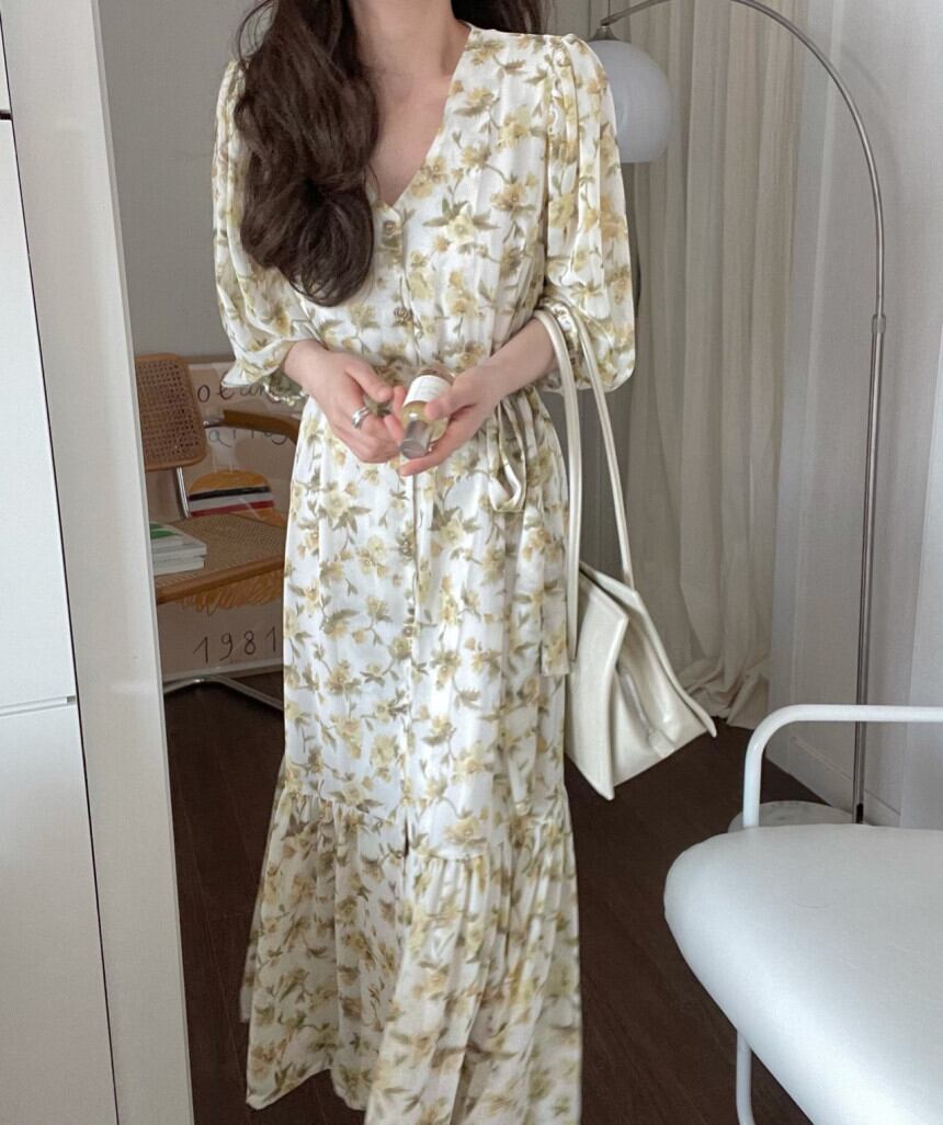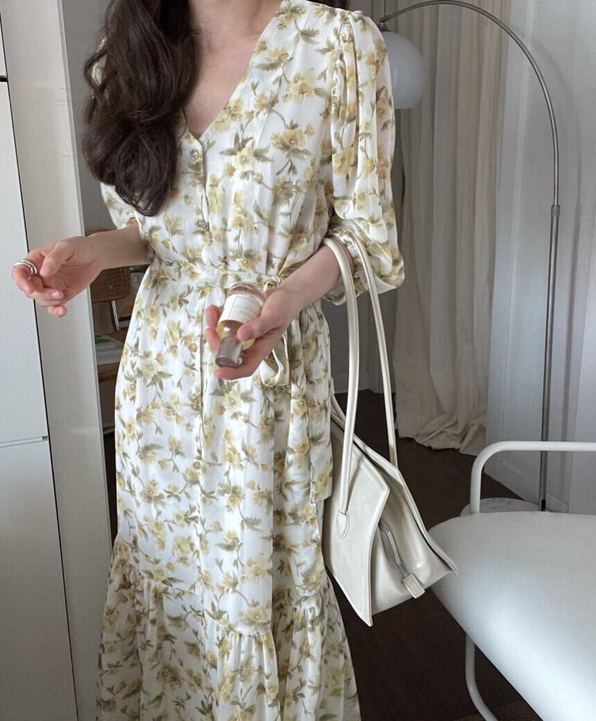 ワンピース レディース 2色 ロング ロング丈 長袖 Vネック シフォン かわいい 大人可愛い きれいめ カジュアル エレガント 清楚 フェミニン おしゃれ お洒落 綺麗 お嬢様 ナチュラル こなれ感 ラブリー キュート ガーリー ロマンチック 抜け感 送料無料 存在感 花柄 小花柄 フラワー 学生 通学 デート お出かけ 女子会 フリーサイズ ホワイト イエロー 春 10代 20代 韓国 韓国系 着回し モテ トレンド 流行 インスタ映え