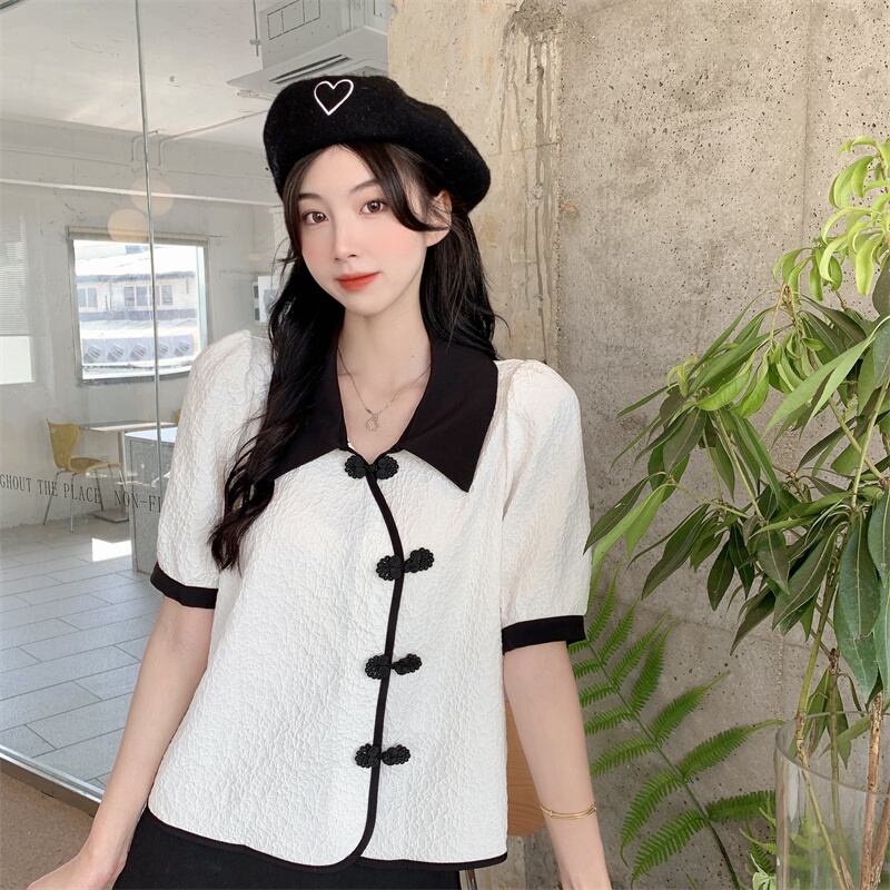 トップス レディース シャツ ブラウス S M L XL 2XL 半袖 パフスリーブ 襟付き ビッグカラー アシンメトリー 刺繍 かわいい 大人可愛い カジュアル おしゃれ お洒落 モード系 こなれ感 ガーリー 個性的 レトロ チャイナ風 通勤 学生 デート お出かけ 女子会 休日 イベント 街歩き 公園 ホワイト 白 ブラック 黒 春 夏 10代 20代 30代 韓国 韓国系 送料無料 普段使い 定番 着回し トレンド ファッション コーデ