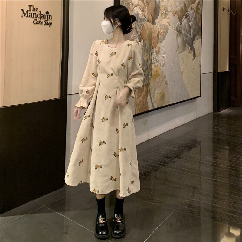 ワンピース レディース 2色 膝下丈 ミディアム丈 フレアワンピース ロング ロング丈 長袖 ラウンドネック ひまわり コーデュロイ かわいい 大人可愛い きれいめ カジュアル エレガント 清楚 フェミニン おしゃれ お洒落 綺麗 お嬢様 ナチュラル こなれ感 ラブリー キュート ガーリー ロマンチック 抜け感 送料無料 存在感 花柄 小花柄 フラワー 学生 通学 デート お出かけ 女子会 S M L ベージュ ブラック 冬 秋 10代 20代 韓国 韓国系 着回し モテ トレンド 流行 インスタ映え