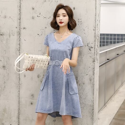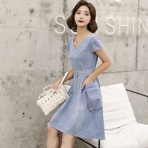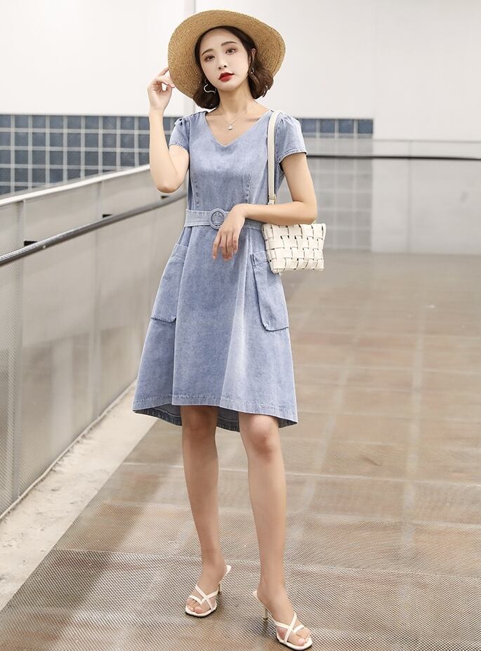 ワンピース レディース デニムワンピース S M L XL 2XL 3XL 大きいサイズ 膝丈 ミドル丈 ウエストマーク ポケット 半袖 Vネック ハイウエスト デニム かわいい 大人可愛い きれいめ シンプル カジュアル おしゃれ お洒落 送料無料 ラフ キュート エレガント 無地 春 夏 秋 10代 20代 30代 40代 学生 通学 デート お出かけ 女子会 休日 着回し 普段使い 重ね着 韓国 韓国系 ファッション コーデ 体型カバー インスタ 青 ブルー