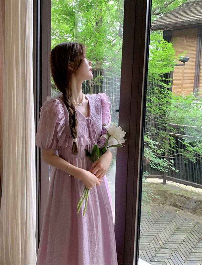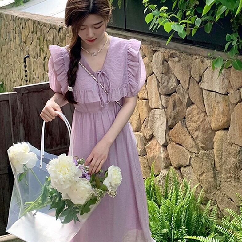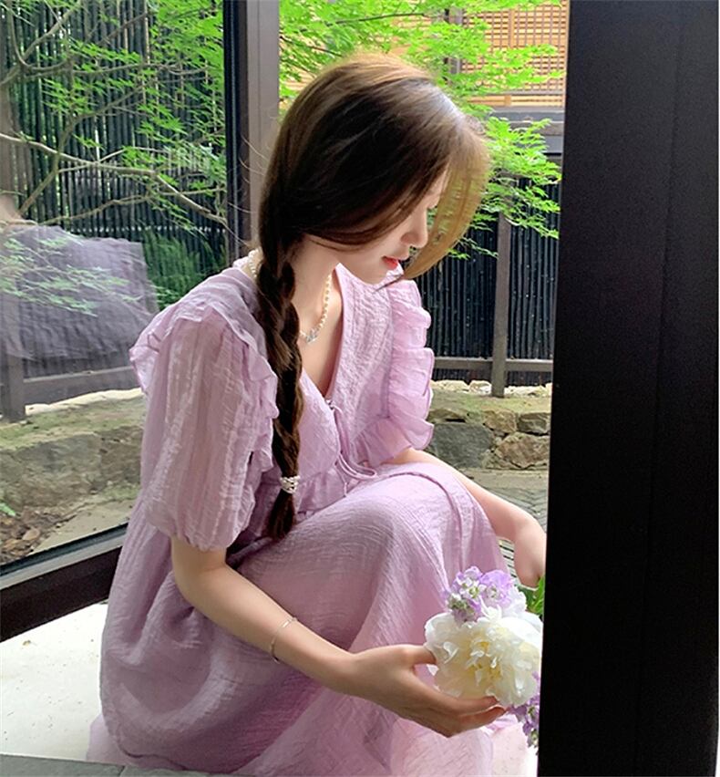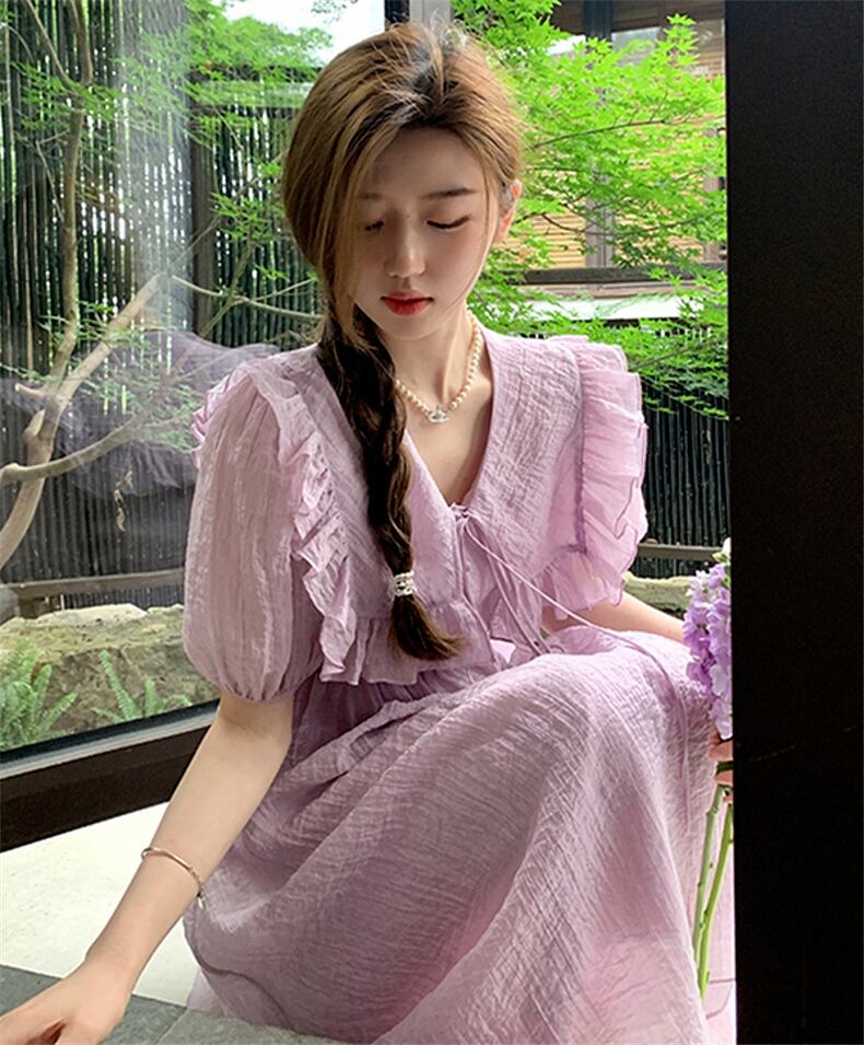 ワンピース レディース Vネック S M L XL 2XL 3XL 大きいサイズ フリル ロングワンピ ワンピドレス ミモレ丈 ロング丈 ビックカラー 半袖 五分袖 Aライン フリル 切り替えデザイン 薄手 かわいい 大人可愛い カジュアル 大人 おしゃれ レトロ 大人女子 こなれ感 ラフ ラブリー キュート ガーリー 個性的 送料無料 抜け感 水玉 夏 10代 20代 30代 OL 学生 デート お出かけ 女子会 休日 街歩き 散歩 着回し 普段使い 韓国系 ファッション モテ 体型カバー パープル 紫