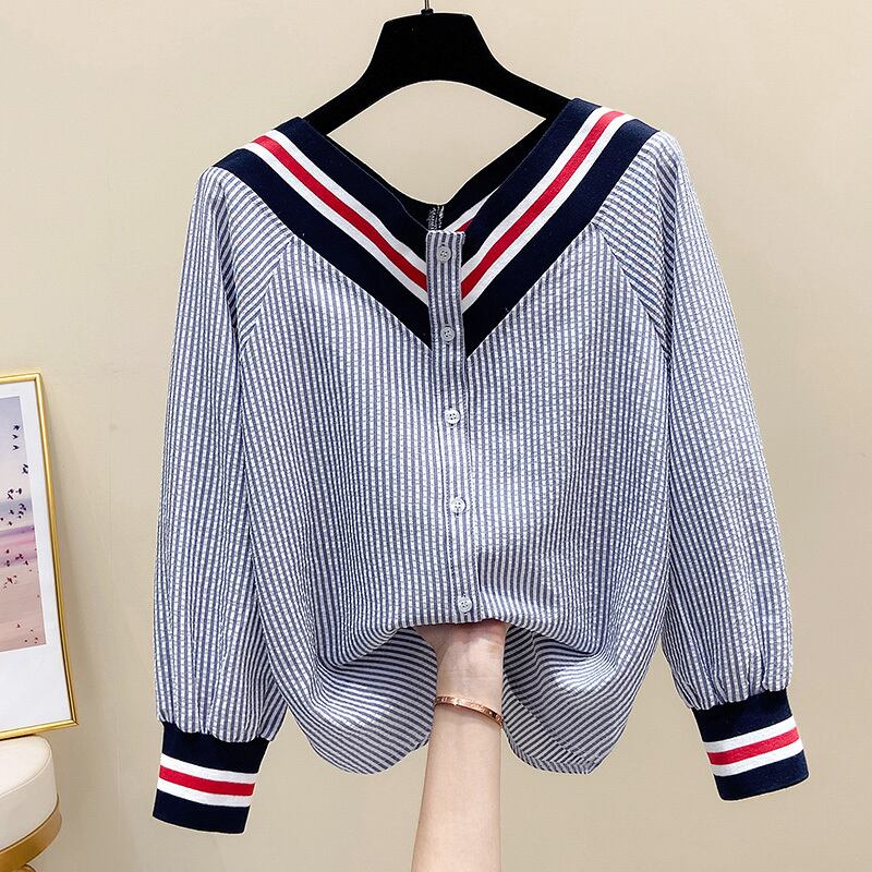 トップス レディース シャツ 2カラー L XL 2XL 3XL 4XL ブルー レッド カラバリ ブラウス Vネック 長袖 ストライプ柄 サイドスリット 前開き 抜け感 シンプル カジュアル フェミニン キュート 大人可愛い おしゃれ 普段使い デート お出かけ 女子会 休日 旅行 通勤 通学 着まわし 送料無料 こなれ感 ユニーク ファッション コーデ スタイル モテ サイズ展開豊富 大きいサイズ 春 秋