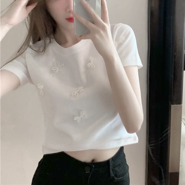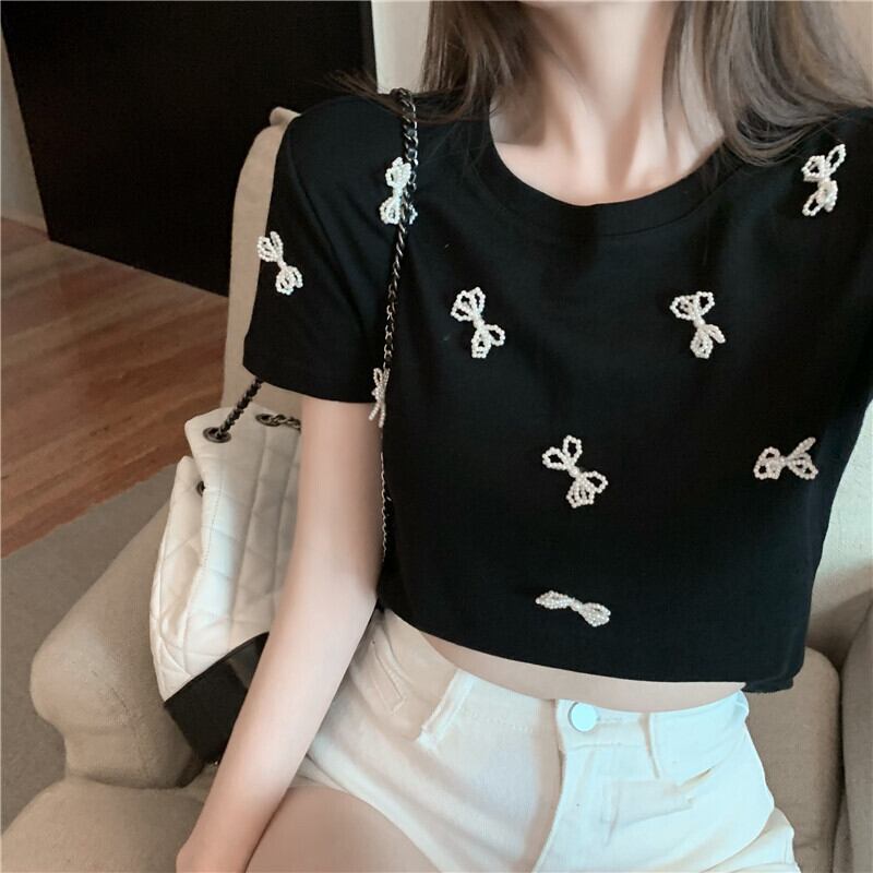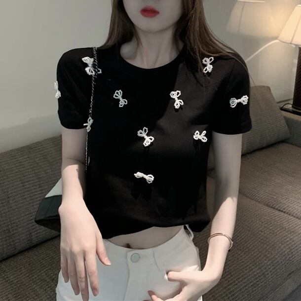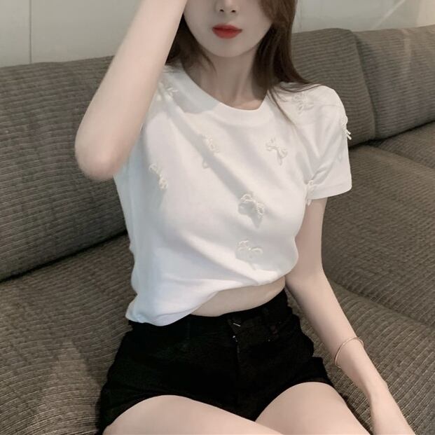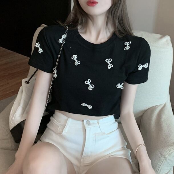 トップス レディース Tシャツ 2カラー S M L XL ホワイト ブラック カラバリ クルーネック 半袖 リボン ビーズ ショート丈 クロップド丈 カットソー プルオーバー 細身 スリム スタイルアップ シンプル カジュアル フェミニン キュート ガーリー 大人可愛い おしゃれ 普段使い デート お出かけ 女子会 休日 旅行 通学 着まわし 送料無料 こなれ感 ユニーク 韓国系 ファッション コーデ スタイル モテ サイズ展開豊富 大きいサイズ 春 夏 秋