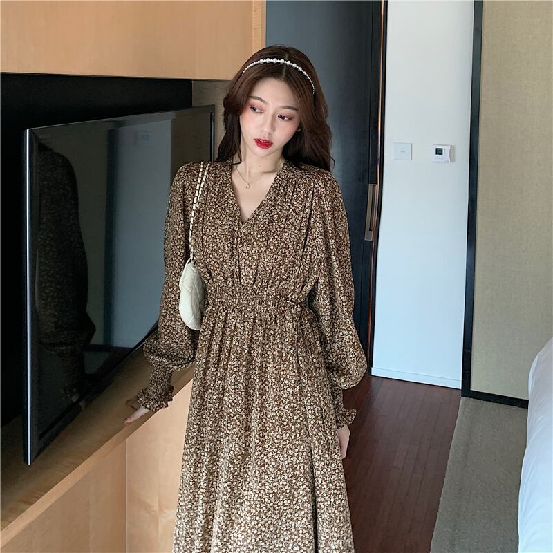 ワンピース レディース 花柄ワンピース 2カラー M L XL 2XL ブラウン ブラック カラバリ フローラルワンピース 小花柄 レトロ 長袖 ロング Vネック Aライン フレア パフスリーブ ハイウエスト スタイルアップ 脚長効果 体型カバー 着痩せ シンプル カジュアル フェミニン キュート ガーリー 大人可愛い おしゃれ 普段使い イベント デート お出かけ 女子会 休日 旅行 通勤 通学 着まわし 送料無料 ファッション コーデ スタイル モテ サイズ展開豊富 大きいサイズ プラスサイズ 春 秋