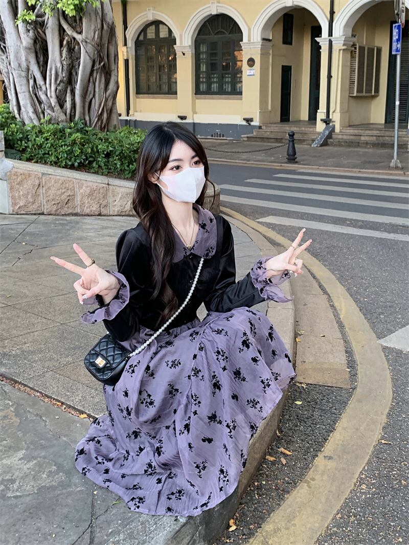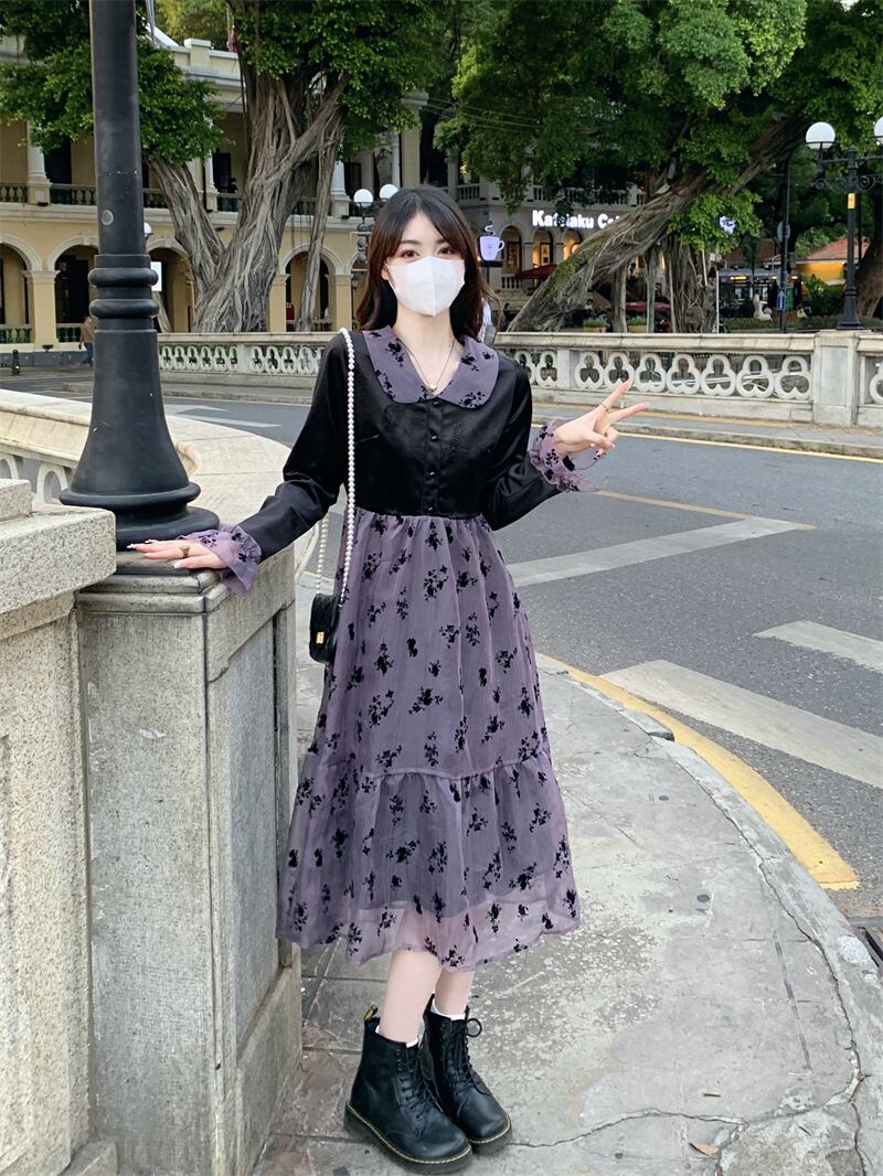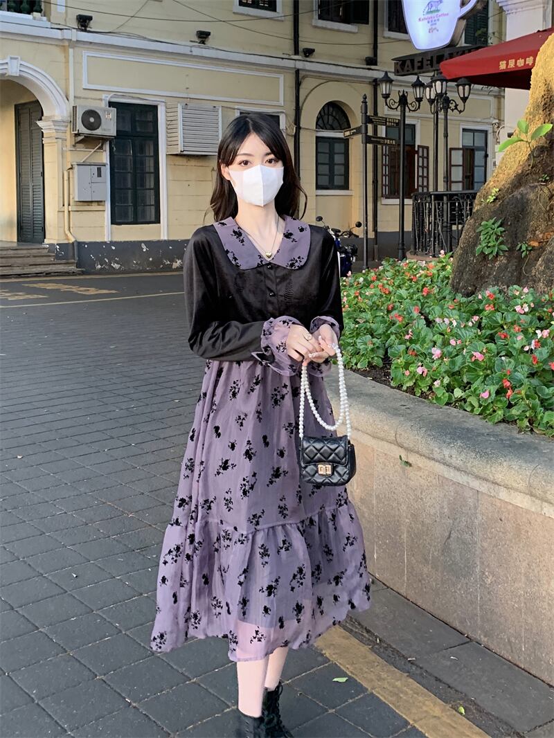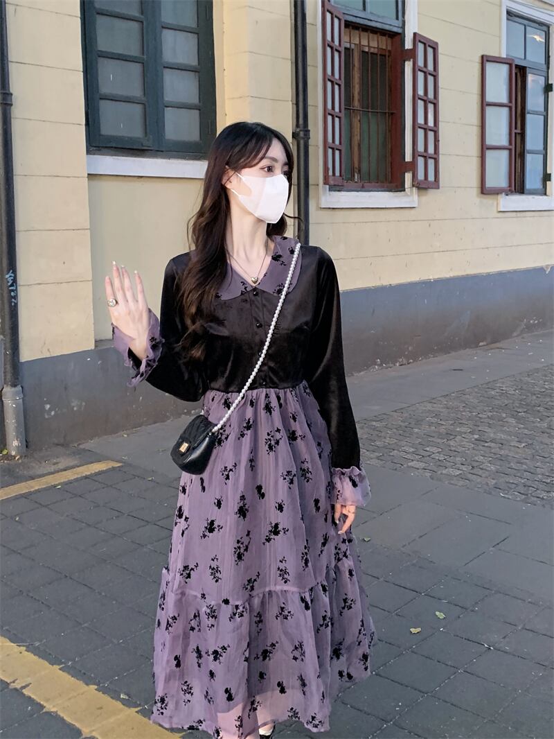 ワンピース レディース フレアワンピース ロングワンピース 袖あり 長袖 襟付き フレア Aライン 切り替え かわいい 大人可愛い シンプル カジュアル フェミニン おしゃれ お洒落 ナチュラル ラブリー キュート ガーリー 個性的 レトロ モダン ロマンチック 抜け感 花柄 学生 通学 デート お出かけ 女子会 休日 旅行 散歩 カフェ 送料無料 S M L パープル 春 秋 冬 10代 20代 30代 40代 ママ 女性用 韓国 着回し 普段使い 重ね着 体型カバー コーデ スタイル プチプラ モテ
