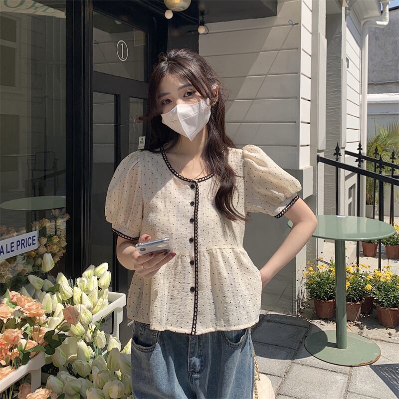 トップス レディース ブラウス M L XL 2XL 3XL 4XL アプリコット ドット柄 水玉模様 シャツ Uネック 半袖 パフスリーブ ペプラム 透け感 ルーズ 体型カバー 華奢見え シンプル きれいめ カジュアル フェミニン キュート ガーリー 大人可愛い おしゃれ 普段使い デート お出かけ 女子会 休日 旅行 通勤 通学 存在感 こなれ感 韓国系 送料無料 ファッション コーデ スタイル モテ サイズ展開豊富 大きいサイズ プラスサイズ 春 夏