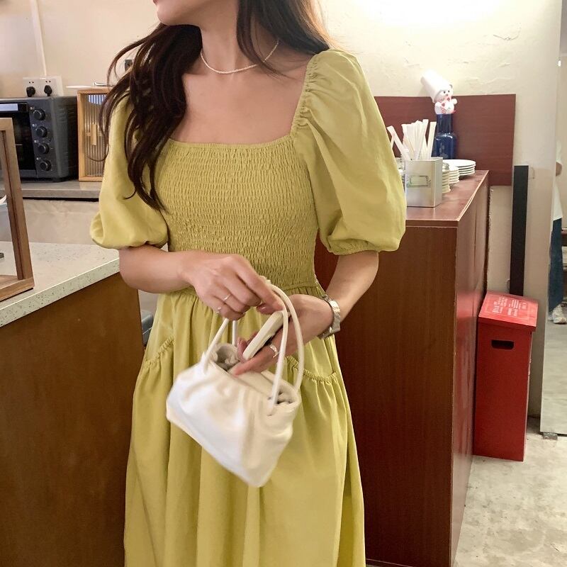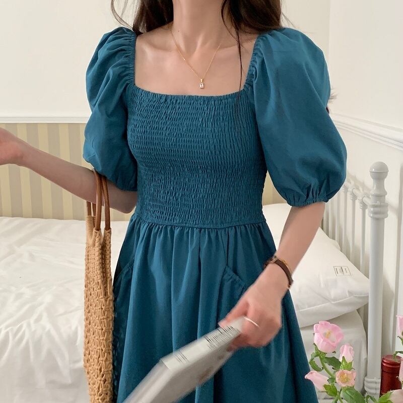 ワンピース レディース 3色 ロングワンピース 半袖 パフスリーブ スクエアネック ハイウエスト かわいい 大人可愛い きれいめ 上品 エレガント おしゃれ お洒落 お嬢様 おとな こなれ感 ラブリー キュート ロマンチック 抜け感 華やか 送料無料 存在感 無地 学生 通学 デート お出かけ 女子会 休日 リゾート 旅行 散歩 カフェ巡り 街歩き お買い物 フリーサイズ ブラック 黒 ブルー 青 グリーン 夏 10代 20代 30代 韓国 韓国系 着回し 普段使い モテ トレンド 流行 インスタ映え