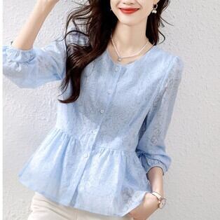 トップス レディース カットソー シャツ ブラウス ミディアム丈 長袖 ラウンドネック ペプラム 裾フレア 切り替え パフスリーブ かわいい 大人可愛い きれいめ カジュアル 上品 エレガント 清楚 おしゃれ 綺麗 お嬢様 おとな こなれ感 ラフ ラブリー キュート 個性的 抜け感 透け感 花柄 フラワー OL 通勤 学生 通学 デート お出かけ 女子会 休日 カフェ巡り 送料無料 公園デビュー S M L XL ライトブルー 水色 春 秋 10代 20代 30代 40代 ママ 韓国 着回し 普段使い