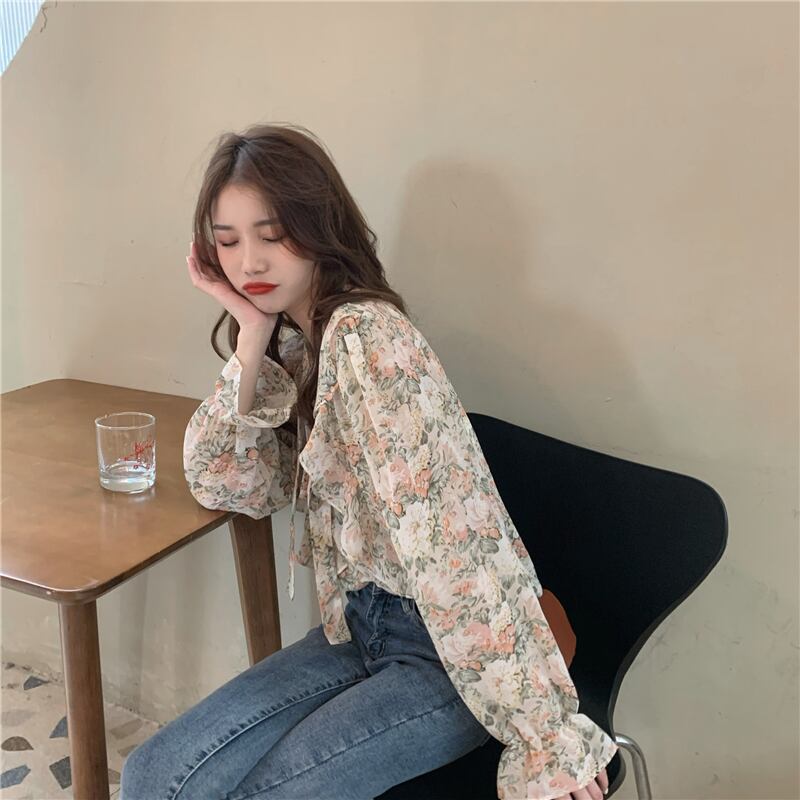 トップス レディース シャツ ブラウス シフォン フリル 長袖 かわいい 大人可愛い きれいめ 上品 エレガント 清楚 フェミニン おしゃれ お洒落 綺麗 お嬢様 こなれ感 ラブリー キュート ロマンチック 抜け感 送料無料 存在感 花柄 小花柄 OL 通勤 学生 通学 デート お出かけ 女子会 休日 フリーサイズ 春 秋 10代 20代 30代 韓国 韓国系 着回し 普段使い 重ね着 ギフト プレゼント ファッション コーデ プチプラ モテ トレンド 流行 インスタ映え