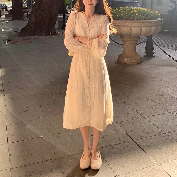 ワンピース レディース 膝下 ミモレ ミモレ丈 ミディアム丈 長袖 Vネック レース かわいい 大人可愛い きれいめ 上品 エレガント 清楚 フェミニン お洒落 綺麗 こなれ感 ラブリー キュート ガーリー ロマンチック 華やか 送料無料 存在感 無地 学生 通学 デート お出かけ 女子会 休日 S M アプリコット 春 夏 10代 20代 30代 40代 韓国 韓国系 着回し 普段使い 体型カバー ファッション コーデ スタイル プチプラ トレンド 流行 インスタ映え