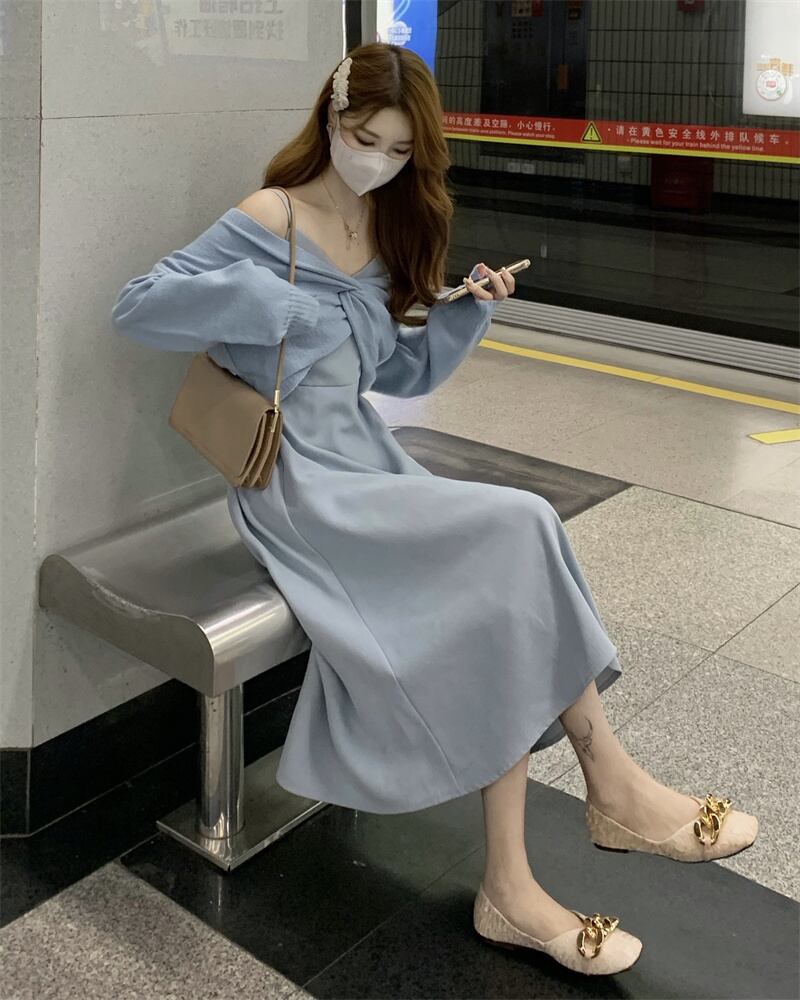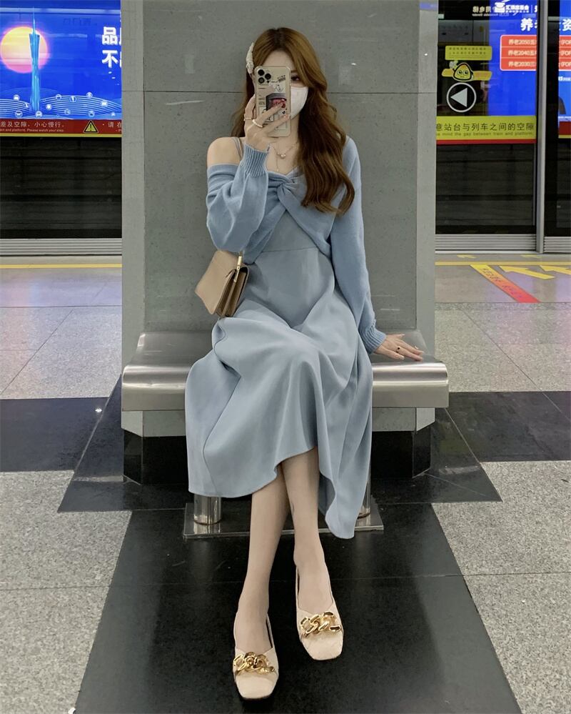 【着用レビュー】トップス ワンピース レディース ニット セーター キャミソールワンピース キャミワンピ ロング ロング丈 長袖 Vネック Aライン 切り替え 裾フレア ゆったり かわいい 大人可愛い きれいめ カジュアル エレガント おしゃれ 綺麗 おとな ナチュラル 送料無料 ラフ ラブリー キュート 抜け感 無地 デート お出かけ 女子会 休日 リゾート 旅行 散歩 カフェ巡り ピクニック ゆったり ゆる ピンク ブルー 春 秋 2点セット ツーピース 20代 30代 韓国系 普段使い