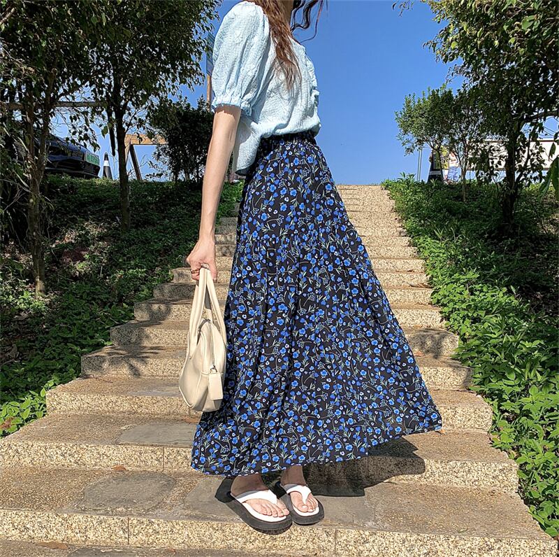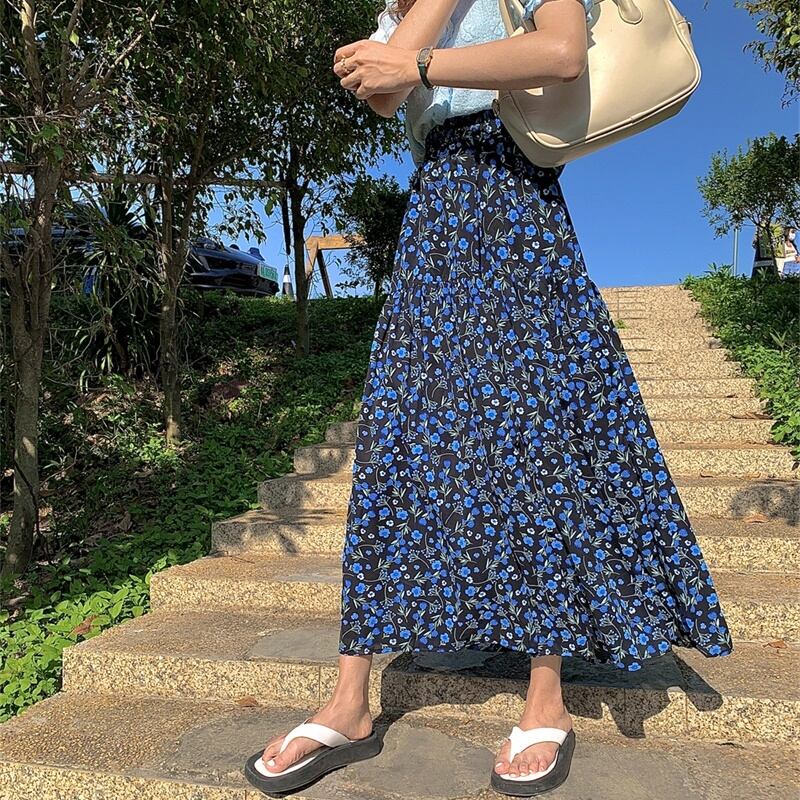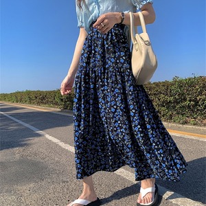 スカート レディース ロングスカート マキシスカート ギャザー 花柄 小花柄 フラワー プリント フレア Aライン ウエストゴム かわいい 大人可愛い カジュアル おしゃれ お洒落 こなれ感 ラフ レトロ ワンサイズ 通勤 デート お出かけ 女子会 休日 リゾート 送料無料 公園 ブルー 青 ブラック 黒 春 夏 20代 30代 40代 韓国系 韓国 普段使い ママ ファッション コーデ 着回し トレンド 体型カバー ラクチン デイリー ゆったり