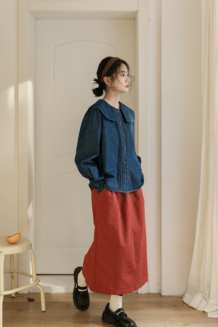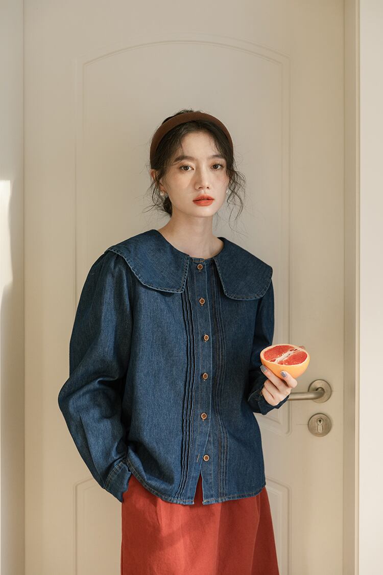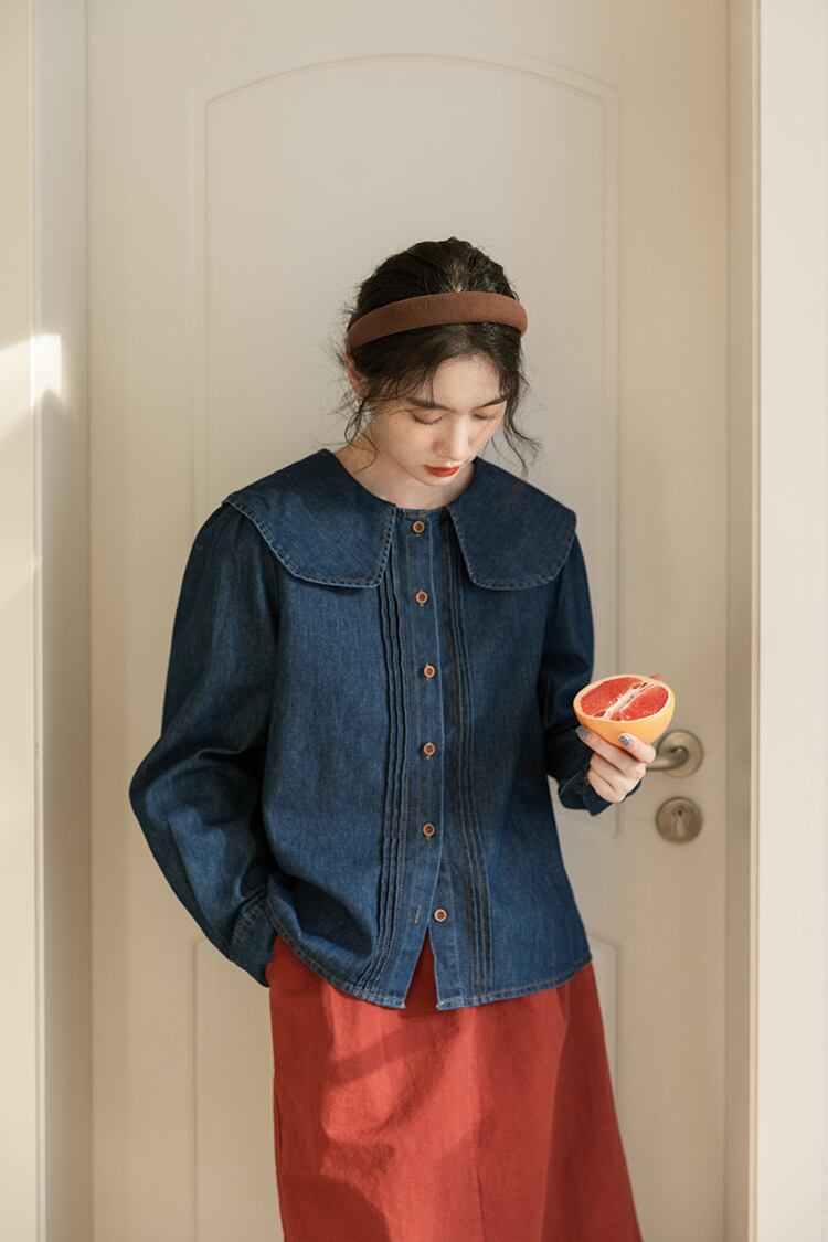 トレンド感溢れる丸襟がポイントのデニムブラウス*