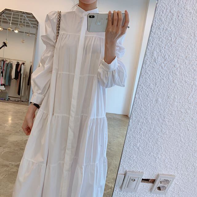 ワンピース レディース シャツワンピース ロングワンピース ミモレ丈 ロング丈 スタンドカラー 長袖 フリル ティアード 黒 ブラック 白 ホワイト 大人可愛い きれいめ 上品 エレガント フェミニン おしゃれ お洒落 お嬢様 ラブリー キュート ガーリー レトロ 華やか 無地 通学 デート お出かけ 女子会 休日 散歩 カフェ巡り 街歩き 春 秋 冬 10代 20代 30代 ワイド ゆったり シック おとな ナチュラル こなれ感 ラフ フリーサイズ 韓国 韓国系 着回し 普段使い 体型カバー 楽ちん