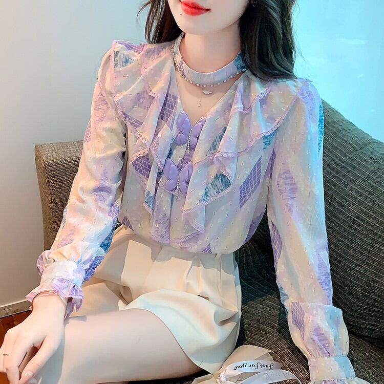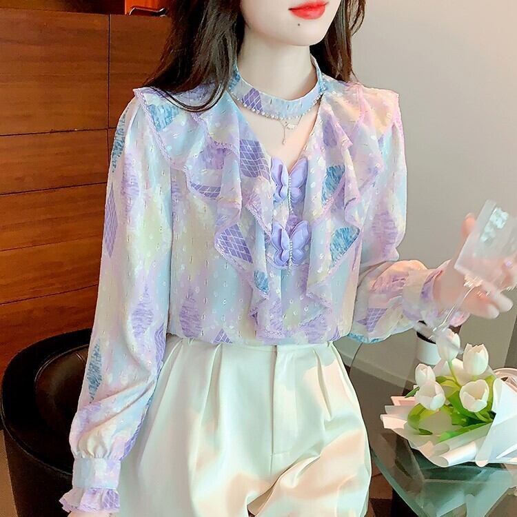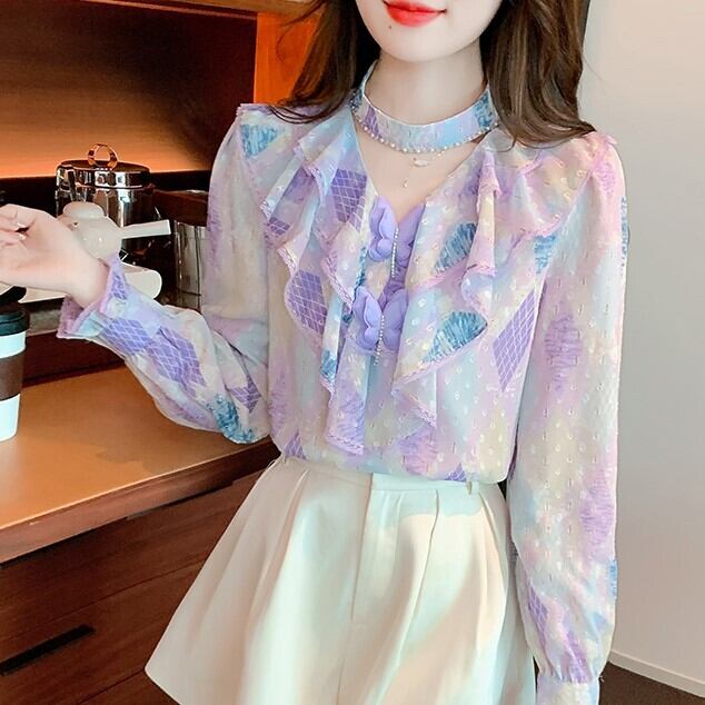 トップス レディース シャツ ブラウス 長袖 ボリューム袖 Vネック スリム 細身 シフォン フリル パール 蝶 パピヨン かわいい 大人可愛い きれいめ シンプル カジュアル 上品 エレガント 清楚 フェミニン おしゃれ 綺麗 お嬢様 セクシー キュート ガーリー 華やか 花柄 デート お出かけ 女子会 パーティー イベント リゾート 旅行 散歩 コンサート ライブ カフェ巡り S M L XL 2XL パープル 春 秋 10代 20代 30代 ママ 韓国系 着回し 普段使い ファッション コーデ モテ