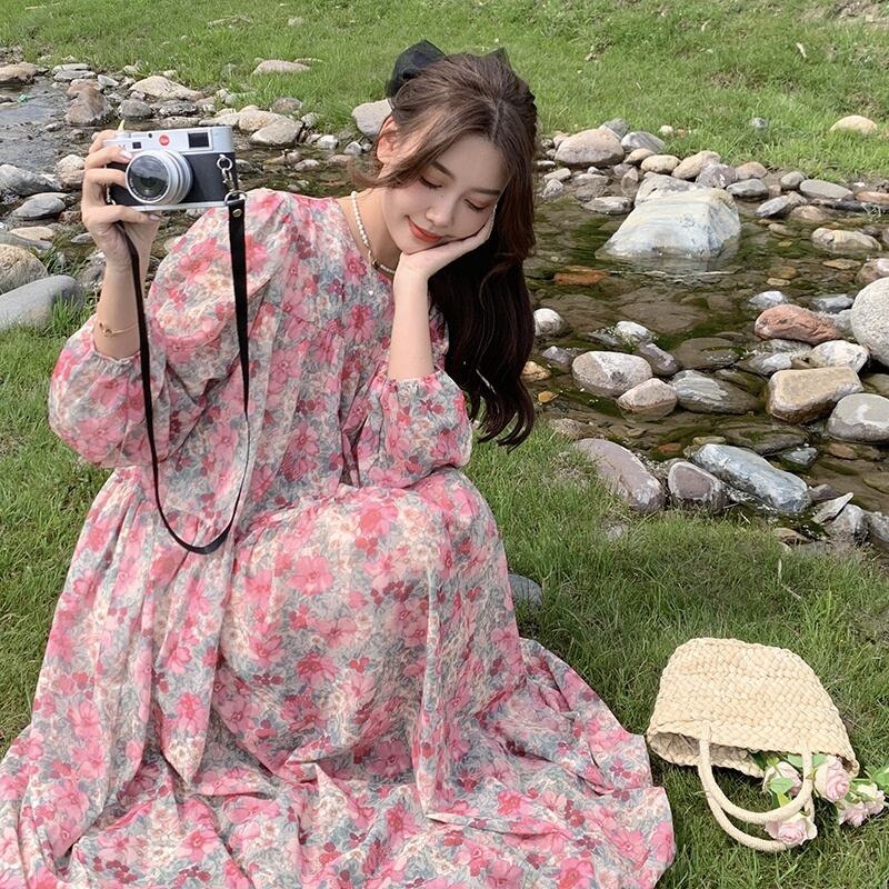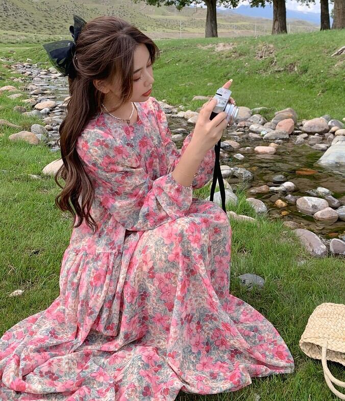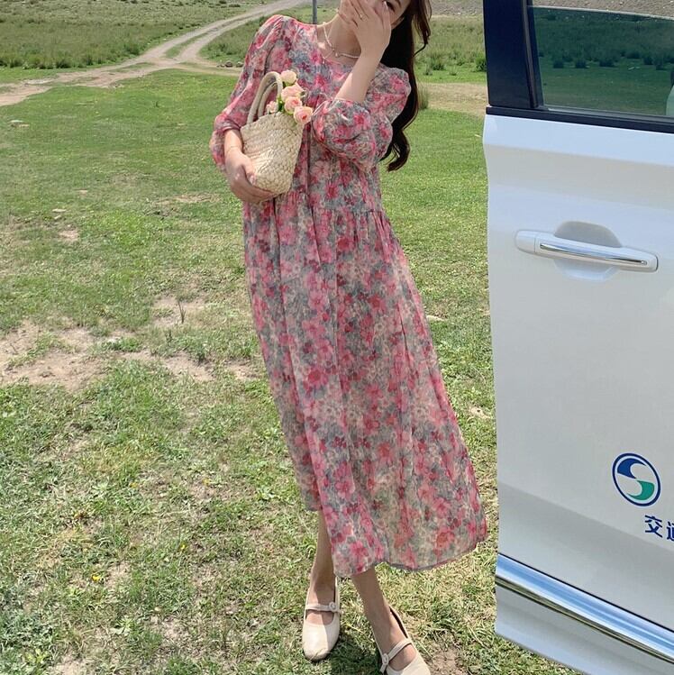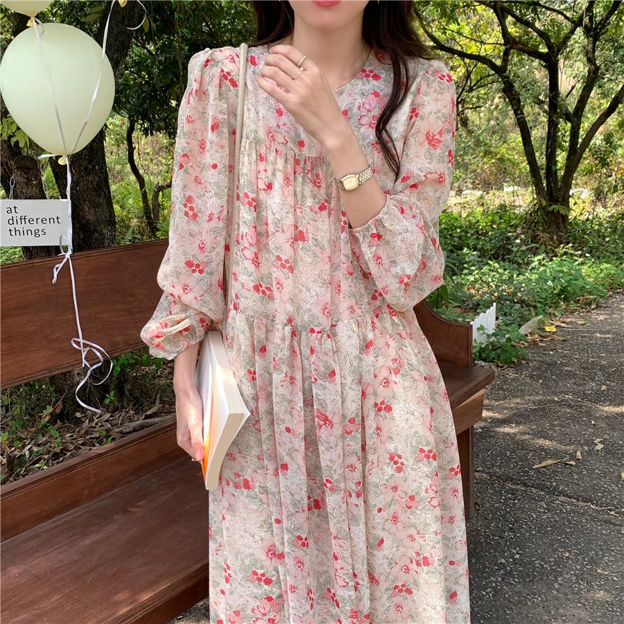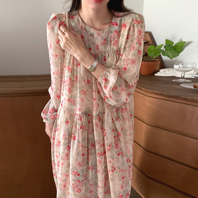 ワンピース レディース シフォンワンピース ロングワンピース ロング ロング丈 長袖 ラウンドネック Aライン シフォン かわいい 大人可愛い きれいめ カジュアル エレガント 清楚 フェミニン おしゃれ 綺麗 お嬢様 おとな こなれ感 ラフ ラブリー キュート ガーリー ルーズ 個性的 アンティーク 華やか 花柄 小花柄 フラワー 花 学生 デート お出かけ 女子会 休日 イベント リゾート 散歩 カフェ巡り 街歩き 公園デビュー フリーサイズ モテ 夏 ピンク アプリコット 10代 20代 30代