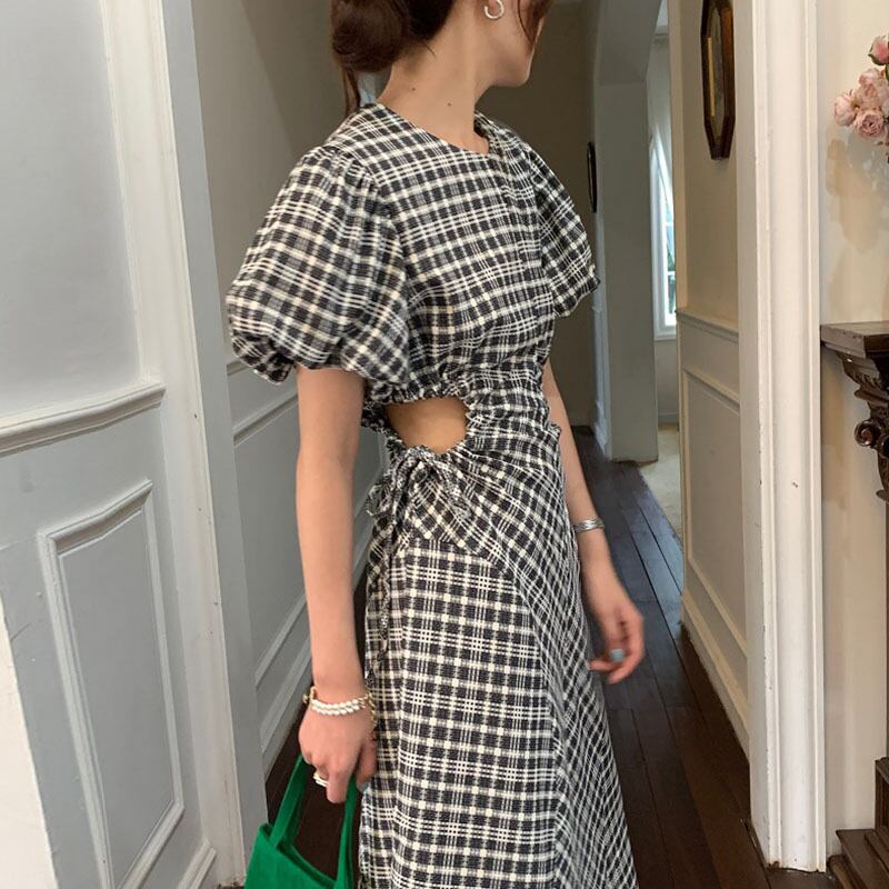 ワンピース レディース ロングワンピース ロング ロング丈 半袖 ボリューム袖 パフスリーブ ラウンドネック Aライン ウエストリボン ハイウエスト かわいい 大人可愛い カジュアル エレガント シック おしゃれ 綺麗 モード系 セクシー おとな ナチュラル こなれ感 ラフ ラブリー キュート ガーリー 個性的 リラックス レトロ モダン 抜け感 チェック柄 格子柄 学生 デート お出かけ 女子会 休日 リゾート 旅行 カフェ巡り 街歩き 公園デビュー フリーサイズ 夏 韓国 着回し 普段使い 体型カバー