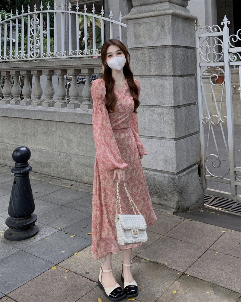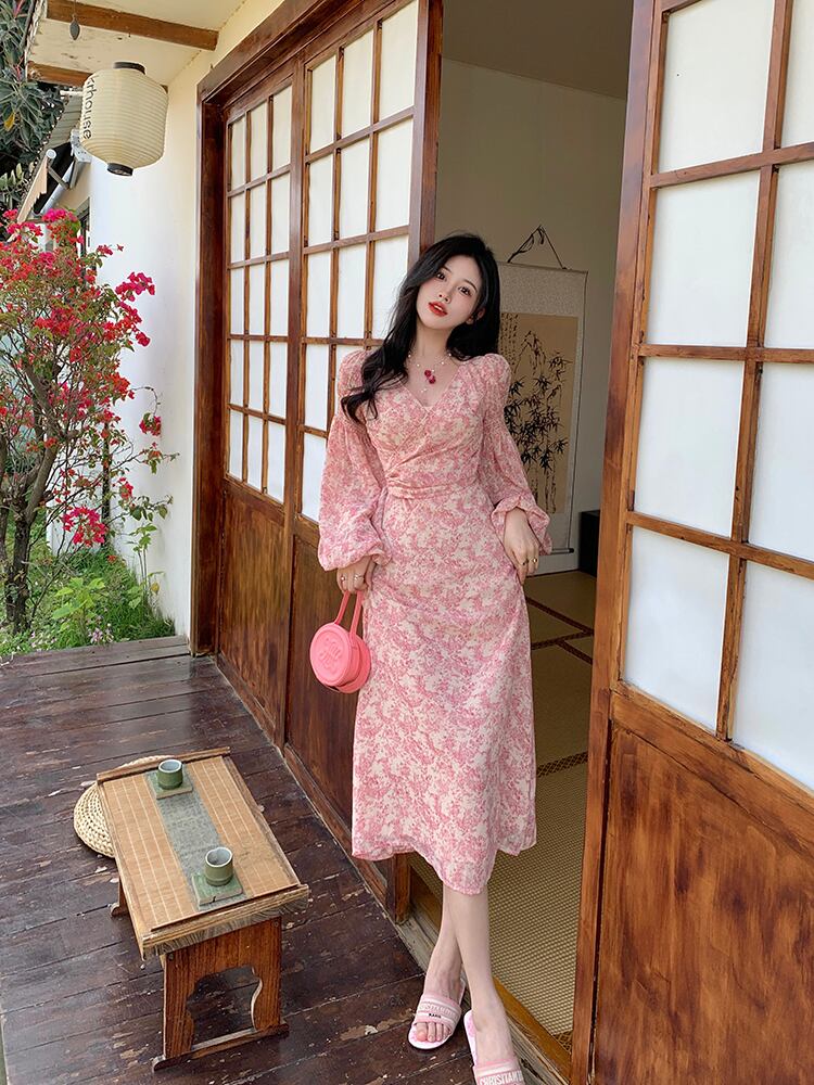 ワンピース レディース ミモレ丈 膝下 ひざ丈 ミディアム 長袖 袖あり ボリューム袖 Vネック トワルドジュイ柄 ランタンスリーブ クロスウエスト スリム 細身 シフォン とろみ感 かわいい 大人可愛い きれいめ 上品 エレガント 清楚 フェミニン おしゃれ 綺麗 お嬢様 ナチュラル こなれ感 ラブリー キュート 個性的 レトロ モダン アンティーク ロマンチック 華やか 花柄 デート お出かけ 女子会 パーティー イベント S M L ピンク 食事会 謝恩会 演奏会 10代 20代 30代 モテ 韓国