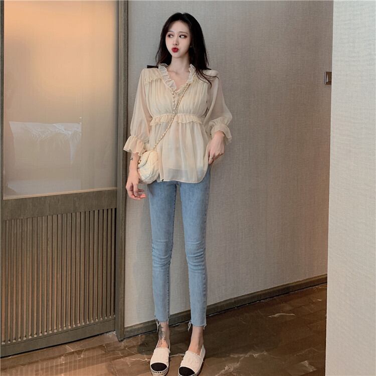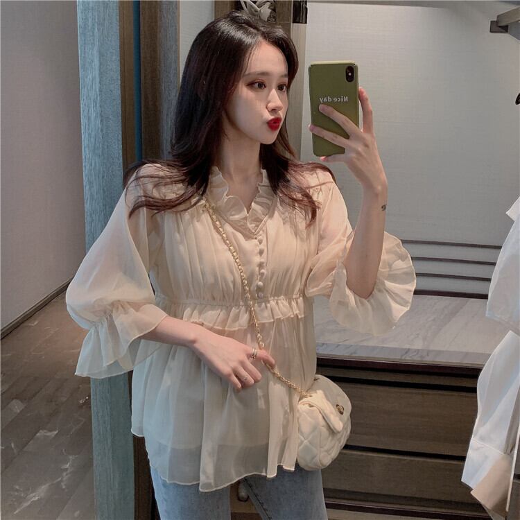 トップス レディース ブラウス 袖あり 7分袖 キャンディスリーブ アンブレラスリーブ Vネック フリル Aライン 透け感 シースルー かわいい 大人可愛い きれいめ シンプル カジュアル 上品 清楚 おしゃれ お洒落 こなれ感 無地 OL 通勤 学生 デート お出かけ 女子会 休日 イベント 街歩き 公園 アプリコット 春 夏 秋 食事会 ママ会 10代 20代 30代 韓国 韓国系 着回し 普段使い デイリー 体型カバー ママ ファッション コーデ スタイル