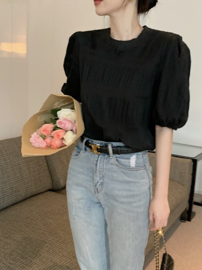 トップス レディース セーター 袖あり 半袖 プルオーバー ラウンドネック シャツ シャーリング しわ加工 きれいめ シンプル 大人可愛い かわいい カジュアル 上品 おしゃれ お洒落 定番 シフォン モード系 おとな こなれ感 ラフ リラックス モダン 大人カジュアル OL 通勤 デート お出かけ 女子会 お泊まり 休日 旅行 散歩 カフェ アフタヌーンティー デイリー ショッピング 送料無料 S M 20代 30代 40代 春 夏 秋 ママ 韓国系 着回し 普段使い 楽ちん ファッション