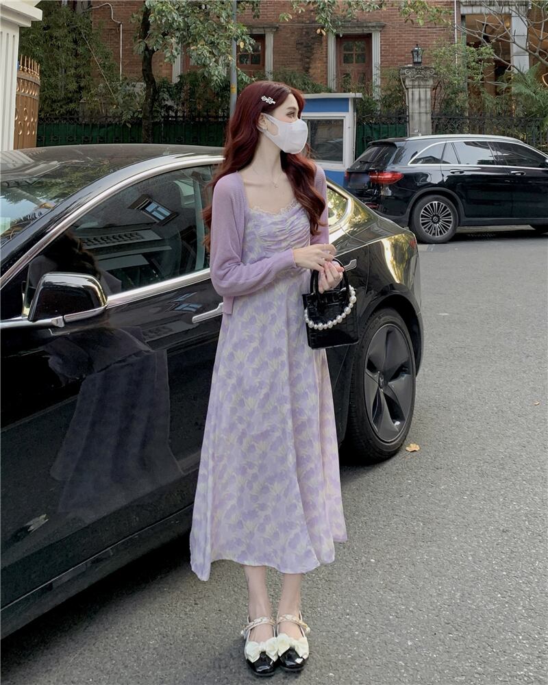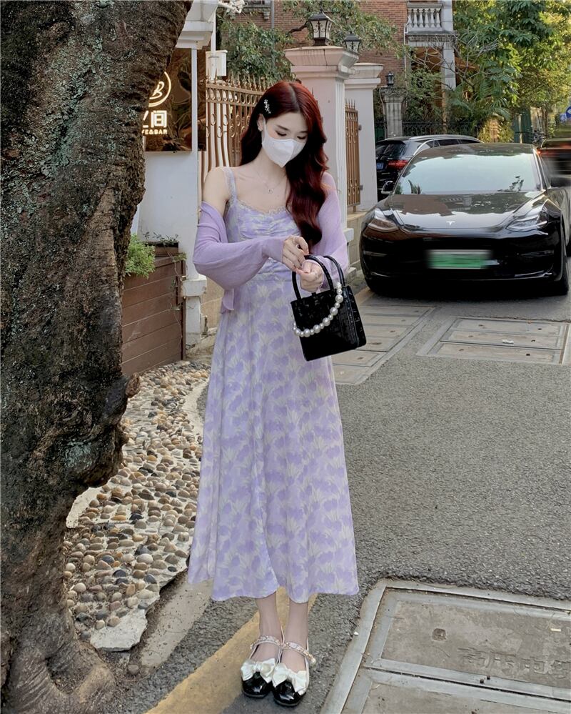 セットアップ レディース 2色 カーディガン キャミソールワンピース ミモレ丈 ノースリーブ 長袖 Vネック フレア 細身 Xライン レース ウエストマーク かわいい 大人可愛い きれいめ カジュアル 上品 エレガント 清楚 フェミニン おしゃれ 綺麗 お嬢様 セクシー おとな ナチュラル こなれ感 キュート ガーリー レトロ 花柄 学生 通学 デート お出かけ 女子会 リゾート 旅行 フリーサイズ ピンク パープル 春 夏 2点セット 10代 20代 30代 ママ 韓国系 体型カバー モテ 送料無料