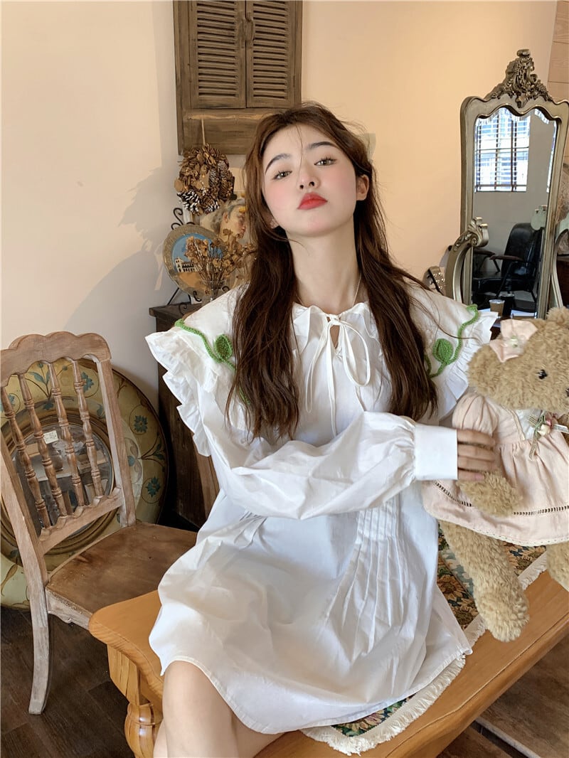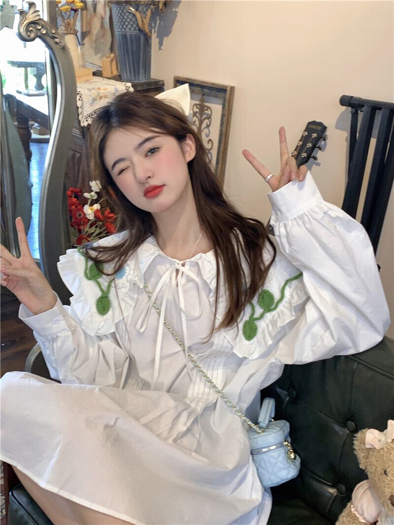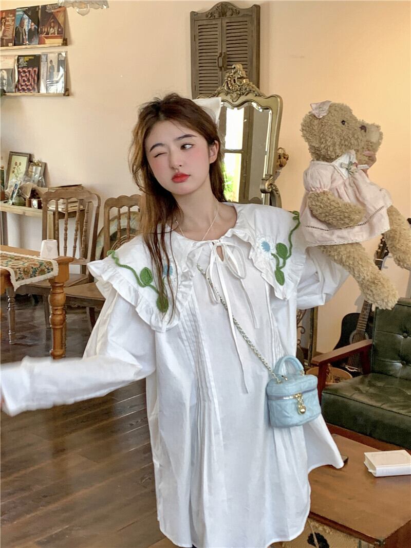 トップス レディース 送料無料 シャツ ブラウス ロング丈 長袖 襟付き ビッグカラー フリル かわいい 大人可愛い きれいめ カジュアル 上品 エレガント 清楚 フェミニン おしゃれ お洒落 お嬢様 おとな ナチュラル こなれ感 ラブリー キュート ガーリー ロマンチック 抜け感 主役級 存在感 無地 学生 通学 デート お出かけ 女子会 休日 カフェ巡り お買い物 フリーサイズ ホワイト 春 秋 10代 20代 30代 韓国 韓国系 着回し 普段使い ファッション コーデ インスタ映え