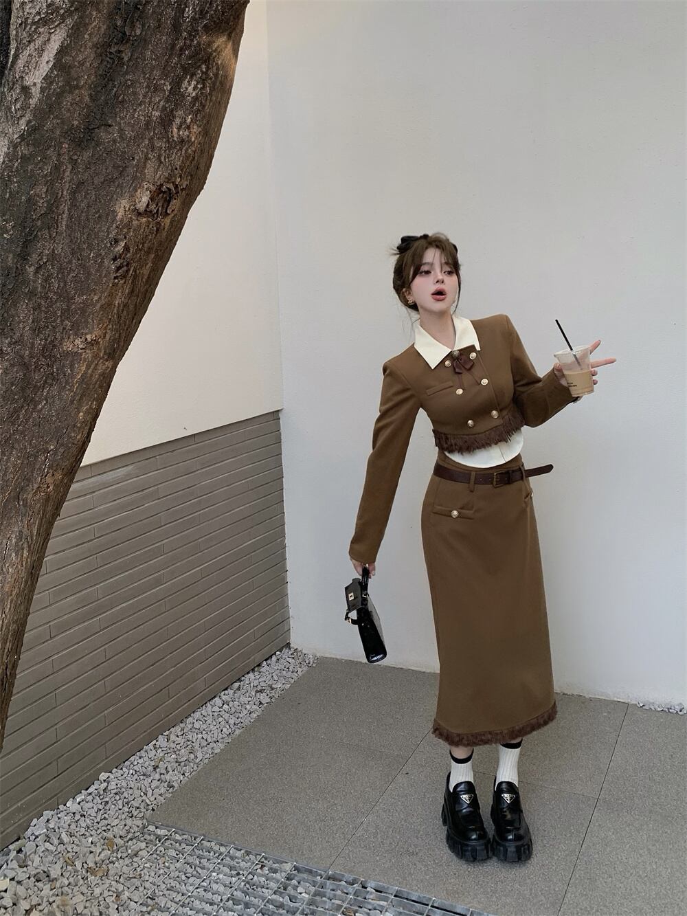 セットアップ レディース ロングスカート ジャケット ミニ丈 ショート丈 長袖 襟対 スリム タイト 細身 ベルト ベルト付 かわいい 大人可愛い きれいめ 上品 シック おしゃれ お洒落 綺麗 クール モード系 セクシー おとな こなれ感 ラブリー ガーリー キュート 個性的 抜け感 無地 OL デート お出かけ 女子会 パーティー イベント お呼ばれ 茶色 ブラウン 春 秋 冬 上下セット 2点セット ツーピース 20代 30代 韓国 韓国系 着回し 普段使い 美脚 脚長 コーデ モテ 送料無料