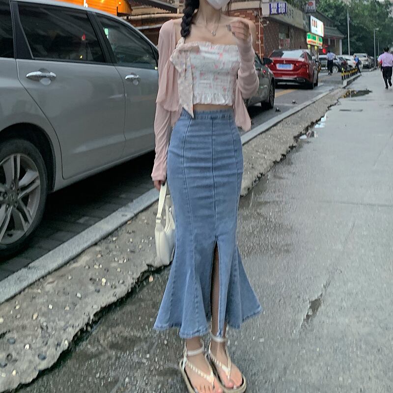 マーメイドラインで華やかで女性らしいシルエットのデニムロングスカート。