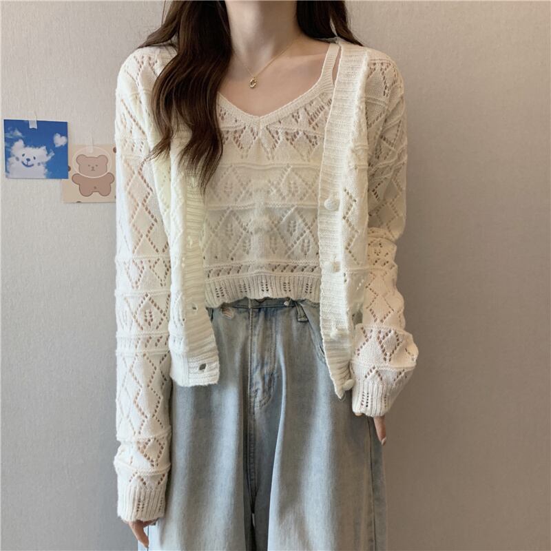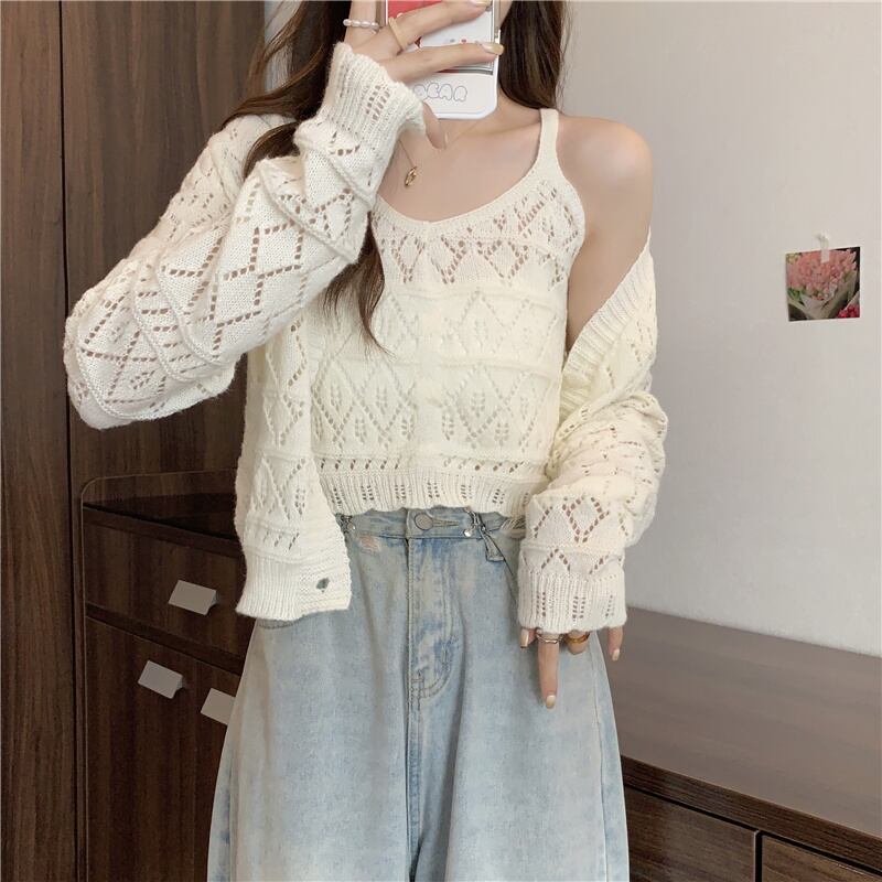 トップス レディース セットアップ アンサンブル カーディガン キャミソール クロップド丈 袖あり 長袖 Vネック レース サマーニット 透け感 薄手 かわいい 大人 可愛い シンプル カジュアル 上品 清楚 おしゃれ お洒落 こなれ感 ガーリー リラックス 抜け感 OL 通勤 学生 デート お出かけ 女子会 休日 イベント 街歩き 公園 ワンサイズ オフホワイト 白 春 夏 秋 2点セット 10代 20代 30代 韓国 韓国系 普段使い 楽ちん 定番 トレンド ママ ファッション コーデ