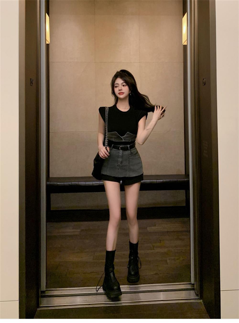 セットアップ レディース トップス ボトムス デニム 2点セット 上下セット S M L 半袖 クルーネック 無地 ブラック ベルト ポケット ショート スタイルアップ 脚長効果 セクシー 大人女子 おしゃれ お洒落 デート お出かけ 女子会 休日 旅行 着まわし ファッション コーデ モテ 送料無料 こなれ感 美脚 大人可愛い カジュアル かっこいい クール ストリート 個性的 モダン ロック 存在感 イベント リゾート 海 コンサート ライブ ショッピング 10代 20代 30代 韓国 韓国系 脚長