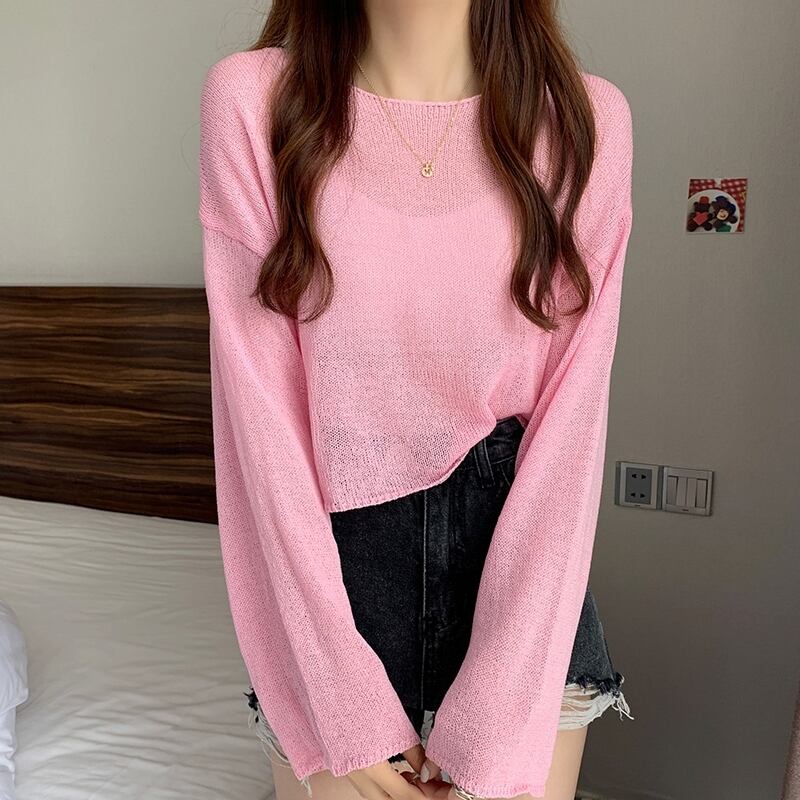 トップス レディース ニット サマーニット S M L XL ショート丈 長袖 フレアスリーブ トランペットスリーブ ラウンドネック ワイド 透け感 薄手 かわいい 大人可愛い きれいめ シンプル カジュアル シック おしゃれ 綺麗 おとな ナチュラル こなれ感 ラフ キュート ガーリー 抜け感 無地 OL 学生 通学 デート お出かけ 女子会 休日 ゆったり ゆる ホワイト ブラック ピンク ブルー イエロー 春 夏 10代 20代 30代 韓国 韓国系 着回し 普段使い 体型カバー 楽ちん 送料無料